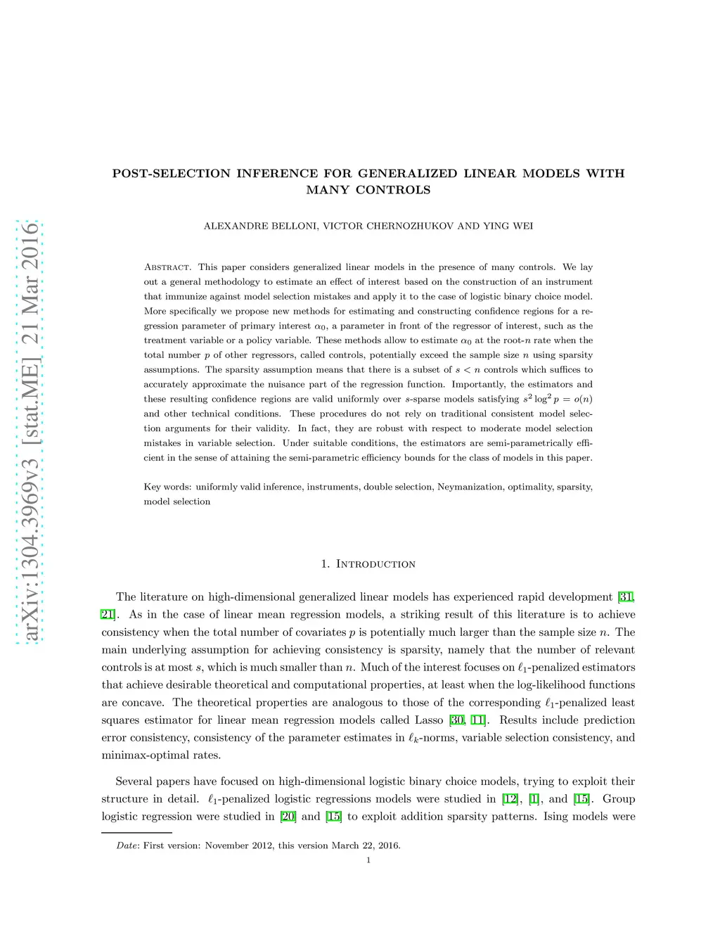 This paper considers generalized linear models in the presence of many controls. We lay out a general methodology to estimate an effect of interest based on the construction of an instrument that immunize against model selection mistakes and apply it to the case of logistic binary choice model. More specifically we propose new methods for estimating and constructing confidence regions for a regression parameter of primary interest , a parameter in front of the regressor of interest, such as the treatment variable or a policy variable. These methods allow to estimate at the root- rate when the total number of other regressors, called controls, potentially exceed the sample size using sparsity assumptions. The sparsity assumption means that there is a subset of controls which suffices to accurately approximate the nuisance part of the regression function. Importantly, the estimators and these resulting confidence regions are valid uniformly over -sparse models satisfying and other technical conditions. These procedures do not rely on traditional consistent model selection arguments for their validity. In fact, they are robust with respect to moderate model selection mistakes in variable selection. Under suitable conditions, the estimators are semi-parametrically efficient in the sense of attaining the semi-parametric efficiency bounds for the class of models in this paper.