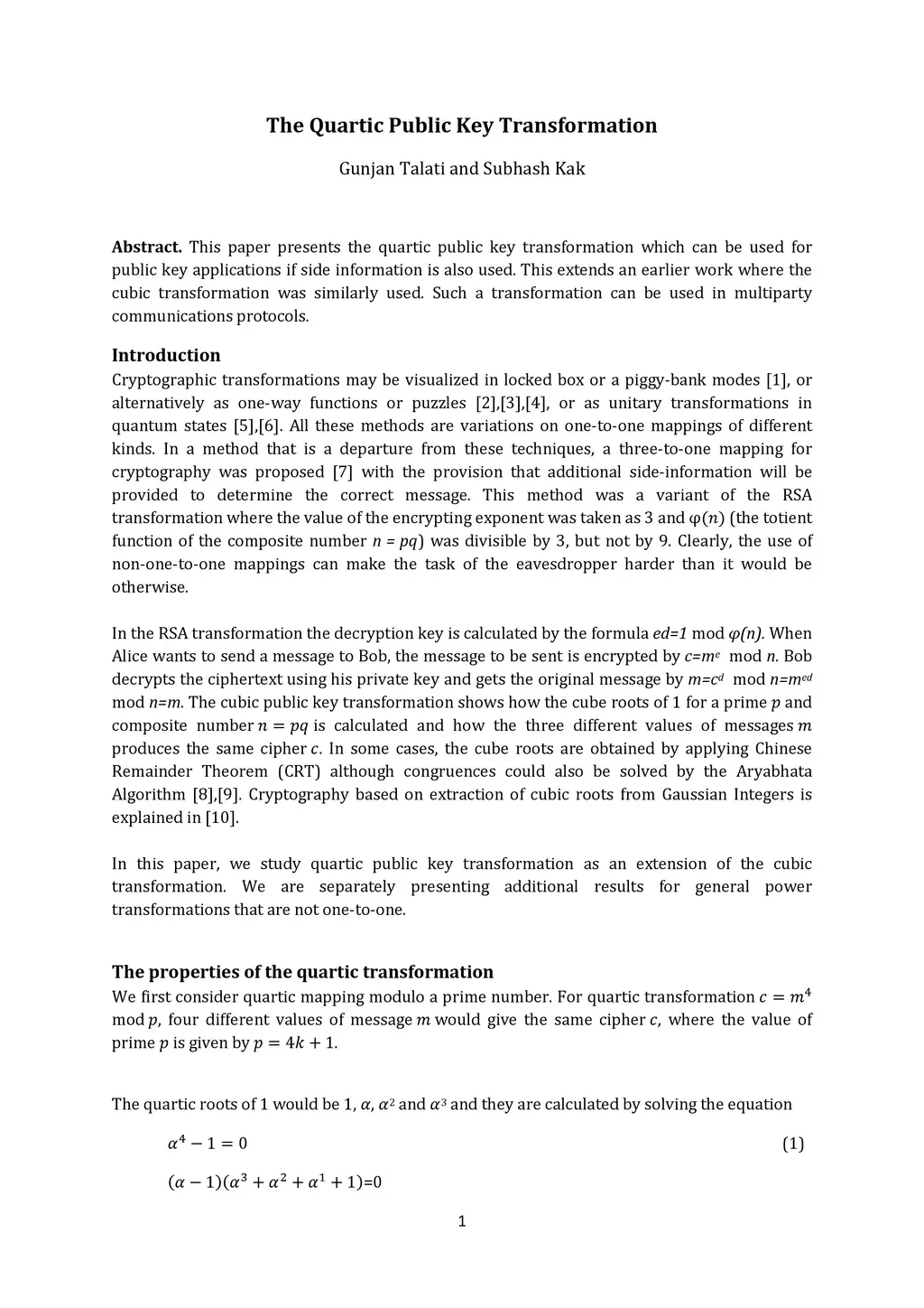This paper presents the quartic public key transformation which can be used for public key applications if side information is also used. This extends an earlier work where the cubic transformation was similarly used. Such a transformation can be used in multiparty communications protocols.