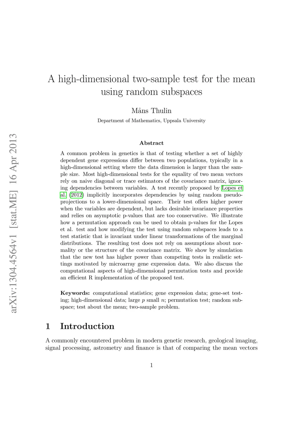 A common problem in genetics is that of testing whether a set of highly dependent gene expressions differ between two populations, typically in a high-dimensional setting where the data dimension is larger than the sample size. Most high-dimensional tests for the equality of two mean vectors rely on naive diagonal or trace estimators of the covariance matrix, ignoring dependencies between variables. A test recently proposed by Lopes et al. (2012) implicitly incorporates dependencies by using random pseudo-projections to a lower-dimensional space. Their test offers higher power when the variables are dependent, but lacks desirable invariance properties and relies on asymptotic p-values that are too conservative. We illustrate how a permutation approach can be used to obtain p-values for the Lopes et al. test and how modifying the test using random subspaces leads to a test statistic that is invariant under linear transformations of the marginal distributions. The resulting test does not rely on assumptions about normality or the structure of the covariance matrix. We show by simulation that the new test has higher power than competing tests in realistic settings motivated by microarray gene expression data. We also discuss the computational aspects of high-dimensional permutation tests and provide an efficient R implementation of the proposed test.