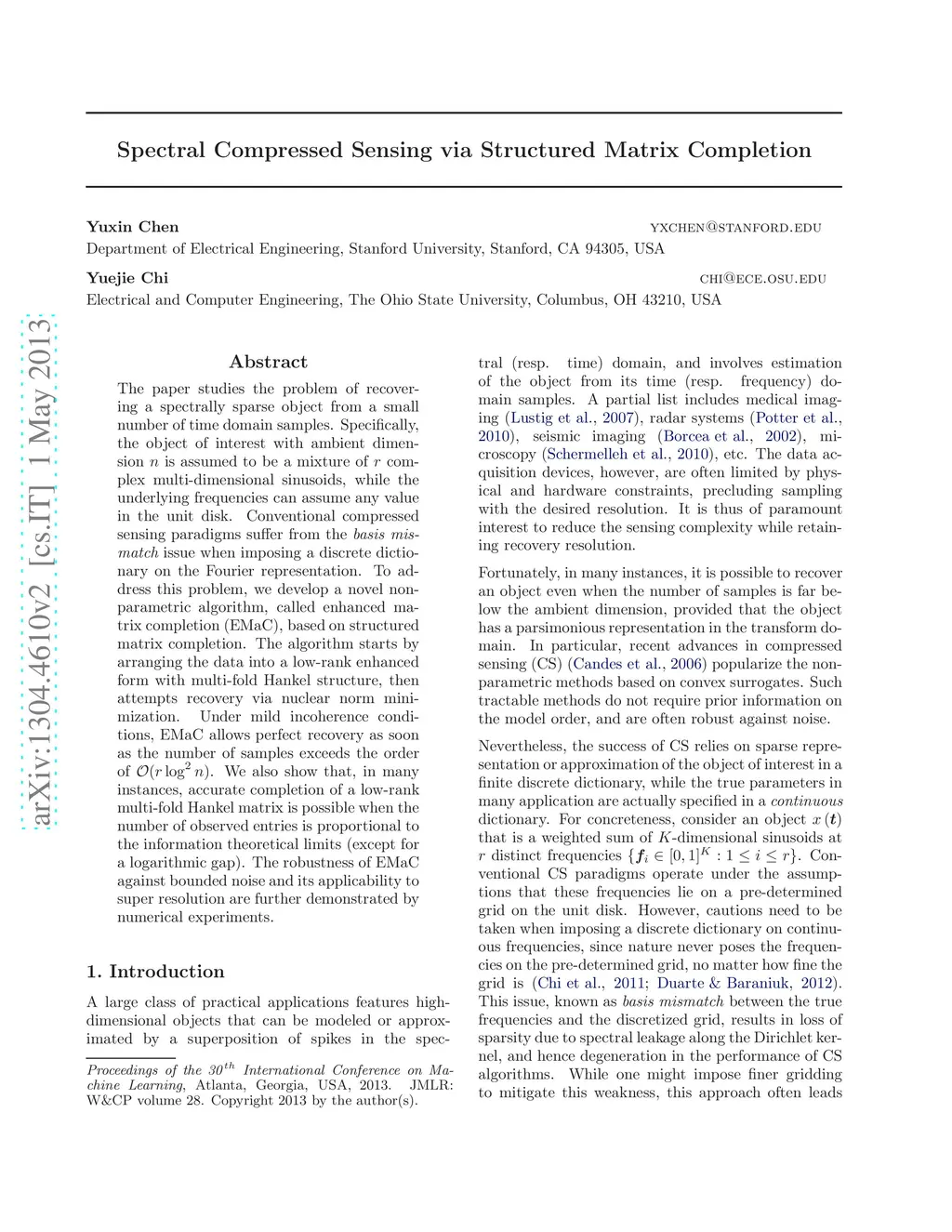 The paper studies the problem of recovering a spectrally sparse object from a small number of time domain samples. Specifically, the object of interest with ambient dimension is assumed to be a mixture of complex multi-dimensional sinusoids, while the underlying frequencies can assume any value in the unit disk. Conventional compressed sensing paradigms suffer from the {\em basis mismatch} issue when imposing a discrete dictionary on the Fourier representation. To address this problem, we develop a novel nonparametric algorithm, called enhanced matrix completion (EMaC), based on structured matrix completion. The algorithm starts by arranging the data into a low-rank enhanced form with multi-fold Hankel structure, then attempts recovery via nuclear norm minimization. Under mild incoherence conditions, EMaC allows perfect recovery as soon as the number of samples exceeds the order of . We also show that, in many instances, accurate completion of a low-rank multi-fold Hankel matrix is possible when the number of observed entries is proportional to the information theoretical limits (except for a logarithmic gap). The robustness of EMaC against bounded noise and its applicability to super resolution are further demonstrated by numerical experiments.