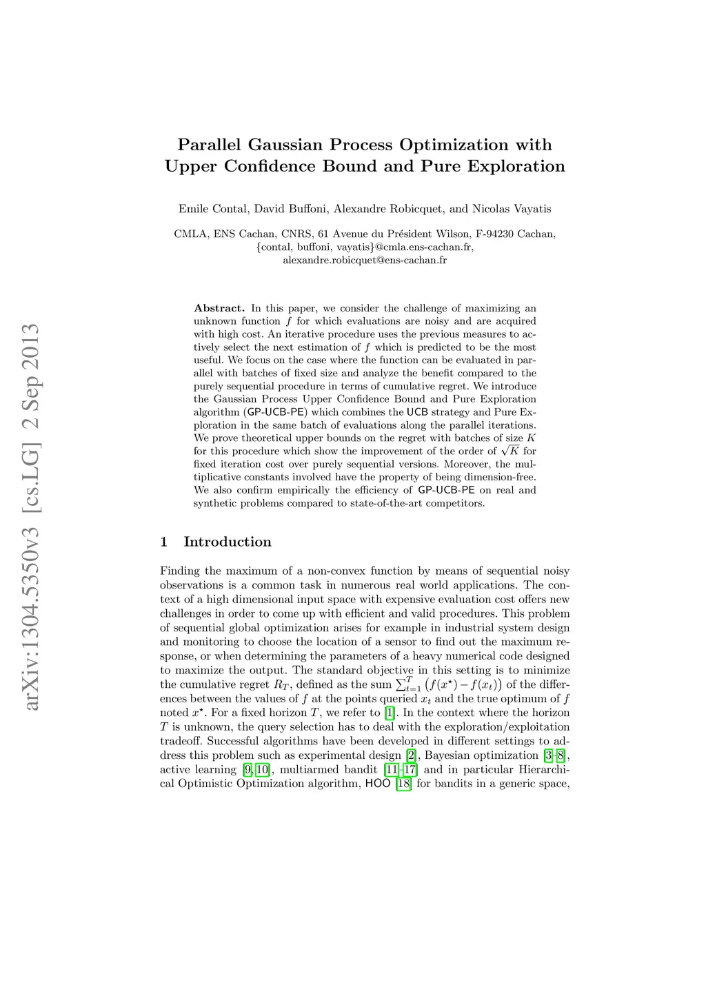 In this paper, we consider the challenge of maximizing an unknown function f for which evaluations are noisy and are acquired with high cost. An iterative procedure uses the previous measures to actively select the next estimation of f which is predicted to be the most useful. We focus on the case where the function can be evaluated in parallel with batches of fixed size and analyze the benefit compared to the purely sequential procedure in terms of cumulative regret. We introduce the Gaussian Process Upper Confidence Bound and Pure Exploration algorithm (GP-UCB-PE) which combines the UCB strategy and Pure Exploration in the same batch of evaluations along the parallel iterations. We prove theoretical upper bounds on the regret with batches of size K for this procedure which show the improvement of the order of sqrt{K} for fixed iteration cost over purely sequential versions. Moreover, the multiplicative constants involved have the property of being dimension-free. We also confirm empirically the efficiency of GP-UCB-PE on real and synthetic problems compared to state-of-the-art competitors.