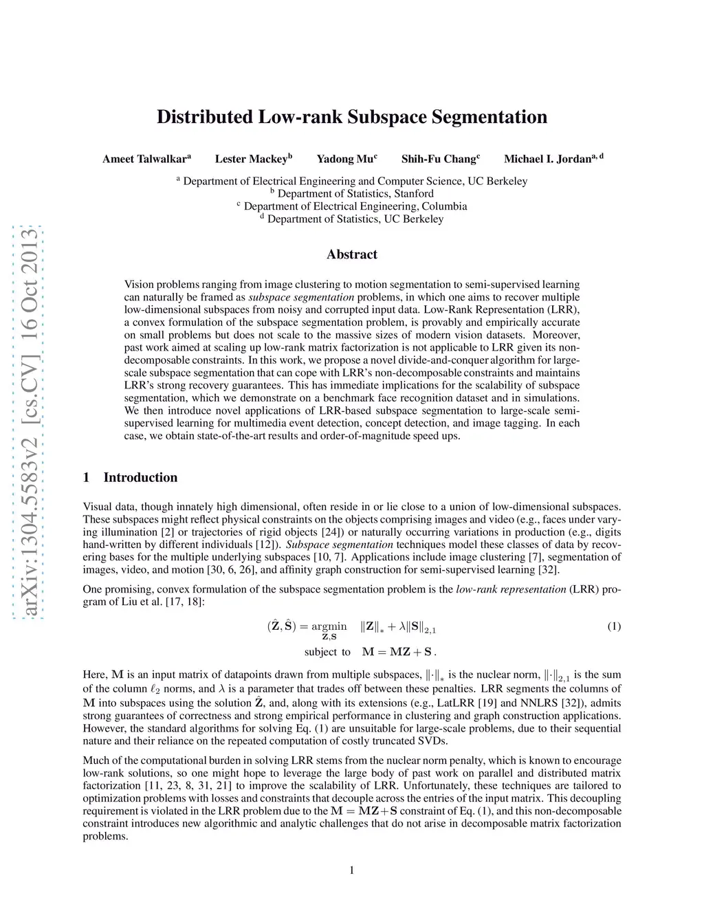 Vision problems ranging from image clustering to motion segmentation to semi-supervised learning can naturally be framed as subspace segmentation problems, in which one aims to recover multiple low-dimensional subspaces from noisy and corrupted input data. Low-Rank Representation (LRR), a convex formulation of the subspace segmentation problem, is provably and empirically accurate on small problems but does not scale to the massive sizes of modern vision datasets. Moreover, past work aimed at scaling up low-rank matrix factorization is not applicable to LRR given its non-decomposable constraints. In this work, we propose a novel divide-and-conquer algorithm for large-scale subspace segmentation that can cope with LRR's non-decomposable constraints and maintains LRR's strong recovery guarantees. This has immediate implications for the scalability of subspace segmentation, which we demonstrate on a benchmark face recognition dataset and in simulations. We then introduce novel applications of LRR-based subspace segmentation to large-scale semi-supervised learning for multimedia event detection, concept detection, and image tagging. In each case, we obtain state-of-the-art results and order-of-magnitude speed ups.