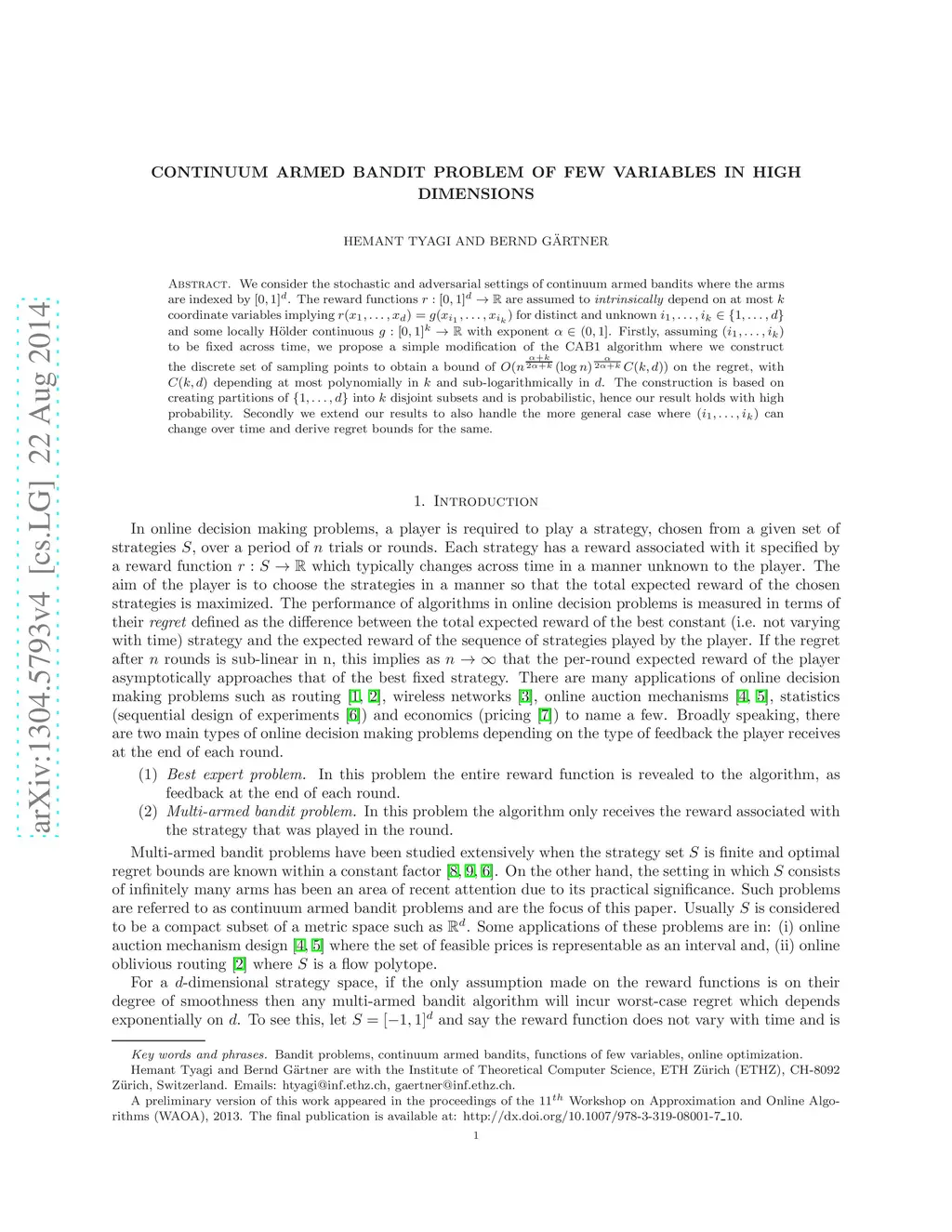 We consider the stochastic and adversarial settings of continuum armed bandits where the arms are indexed by [0,1]^d. The reward functions r:[0,1]^d -> R are assumed to intrinsically depend on at most k coordinate variables implying r(x_1,..,x_d) = g(x_{i_1},..,x_{i_k}) for distinct and unknown i_1,..,i_k from {1,..,d} and some locally Holder continuous g:[0,1]^k -> R with exponent 0 < alpha <= 1. Firstly, assuming (i_1,..,i_k) to be fixed across time, we propose a simple modification of the CAB1 algorithm where we construct the discrete set of sampling points to obtain a bound of O(n^((alpha+k)/(2*alpha+k)) (log n)^((alpha)/(2*alpha+k)) C(k,d)) on the regret, with C(k,d) depending at most polynomially in k and sub-logarithmically in d. The construction is based on creating partitions of {1,..,d} into k disjoint subsets and is probabilistic, hence our result holds with high probability. Secondly we extend our results to also handle the more general case where (i_1,...,i_k) can change over time and derive regret bounds for the same.