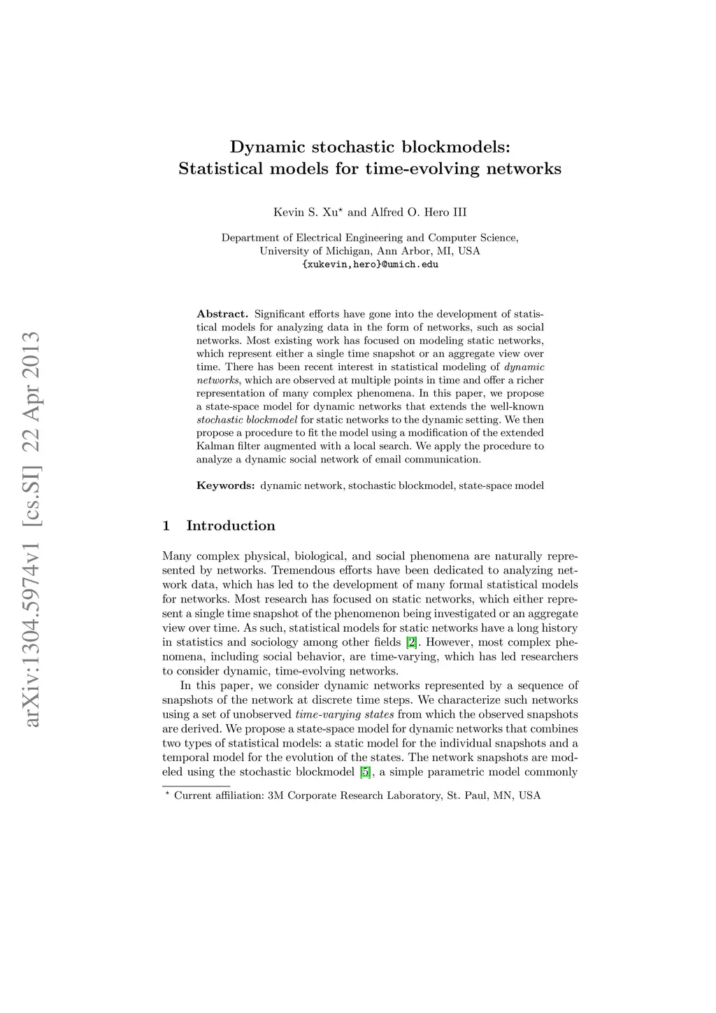 Significant efforts have gone into the development of statistical models for analyzing data in the form of networks, such as social networks. Most existing work has focused on modeling static networks, which represent either a single time snapshot or an aggregate view over time. There has been recent interest in statistical modeling of dynamic networks, which are observed at multiple points in time and offer a richer representation of many complex phenomena. In this paper, we propose a state-space model for dynamic networks that extends the well-known stochastic blockmodel for static networks to the dynamic setting. We then propose a procedure to fit the model using a modification of the extended Kalman filter augmented with a local search. We apply the procedure to analyze a dynamic social network of email communication.