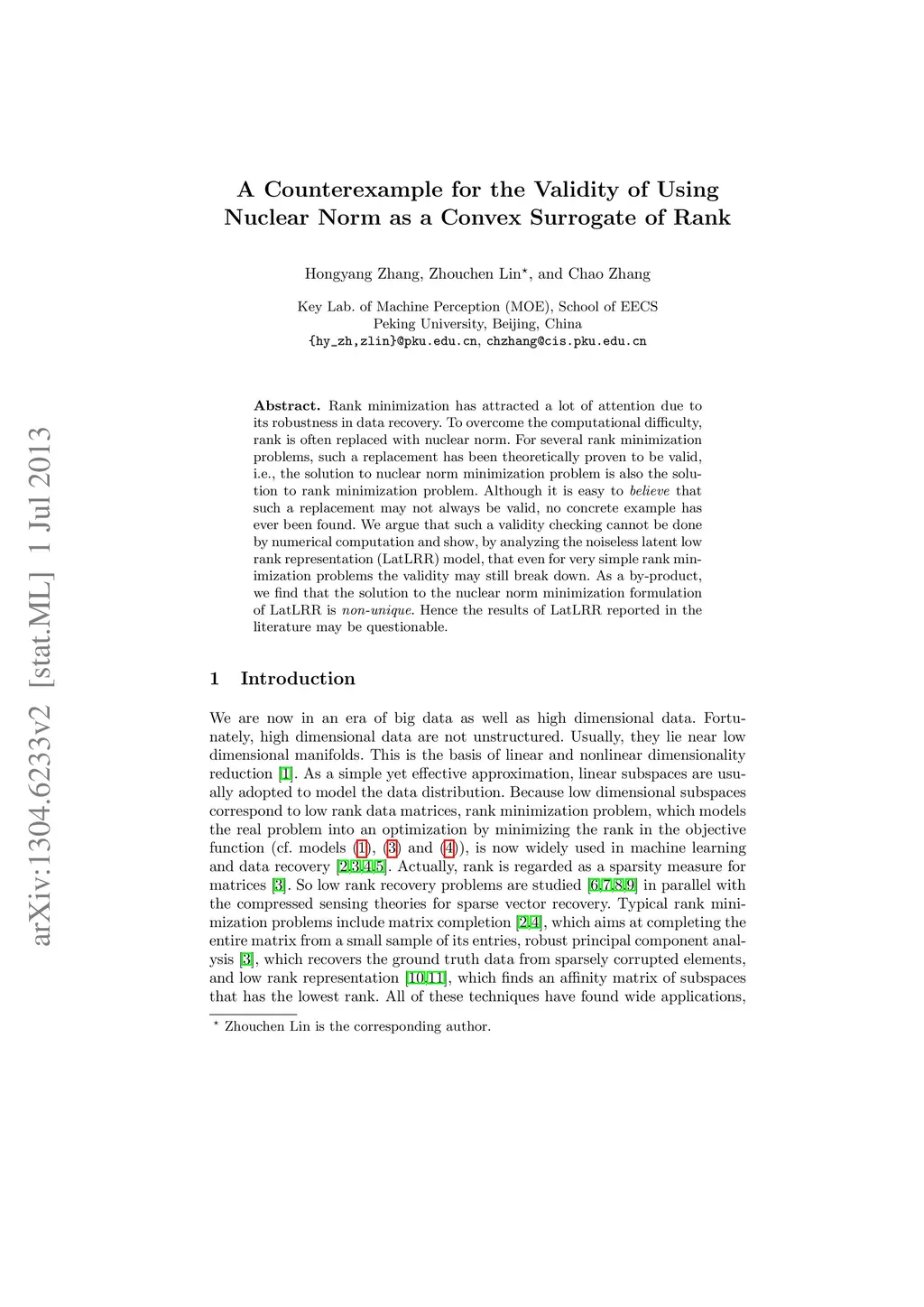 Rank minimization has attracted a lot of attention in recent years due to its robustness in data recovery. To overcome the computational difficulty, rank is often replaced with its convex surrogate, nuclear norm. For several rank minimization problems (RMPs), such a replacement has been theoretically proven to be valid, i.e., the solution to nuclear norm minimization problem (NNMP) is also the solution to RMP. Although it is easy to believe that such a replacement may not always be valid, no concrete example has ever been found. We argue that such a validity checking cannot be done by numerical computation and show, by analyzing the noiseless latent low rank representation (LatLRR) model, that even for very simple RMPs the validity of replacing rank with nuclear norm may still break down. So a practitioner should not take for granted to replace rank with nuclear norm. As a by-product, we find that the solution to the NNMP formulation of LatLRR is non-unique. Hence the results of LatLRR reported in the literature may be questionable.