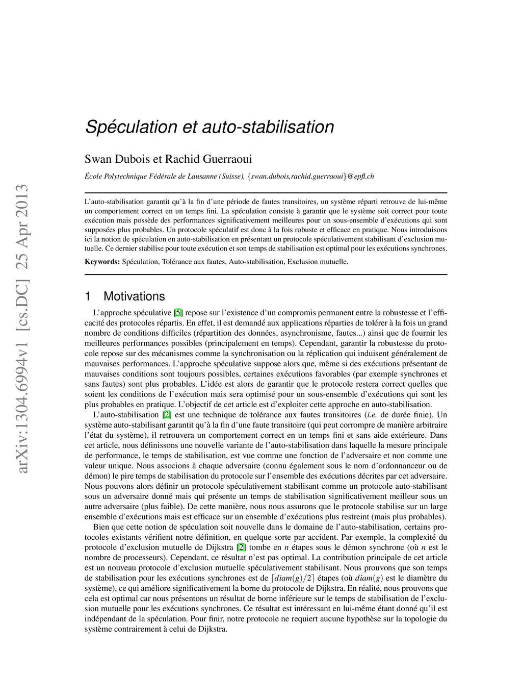 Self-stabilization ensures that, after any transient fault, the system recovers in a finite time and eventually exhibits a correct behaviour. Speculation consists in guaranteeing that the system satisfies its requirements for any execution but exhibits significantly better performances for a subset of executions that are more probable. A speculative protocol is in this sense supposed to be both robust and efficient in practice. We introduce the notion of speculative stabilization which we illustrate through the mutual exclusion problem. We then present a novel speculatively stabilizing mutual exclusion protocol. Our protocol is self-stabilizing for any asynchronous execution. We prove that its stabilization time for synchronous executions is diam(g)/2 steps (where diam(g) denotes the diameter of the system). This complexity result is of independent interest. The celebrated mutual exclusion protocol of Dijkstra stabilizes in n steps (where n is the number of processes) in synchronous executions and the question whether the stabilization time could be strictly smaller than the diameter has been open since then (almost 40 years). We show that this is indeed possible for any underlying topology. We also provide a lower bound proof that shows that our new stabilization time of diam(g)/2 steps is optimal for synchronous executions, even if asynchronous stabilization is not required.
