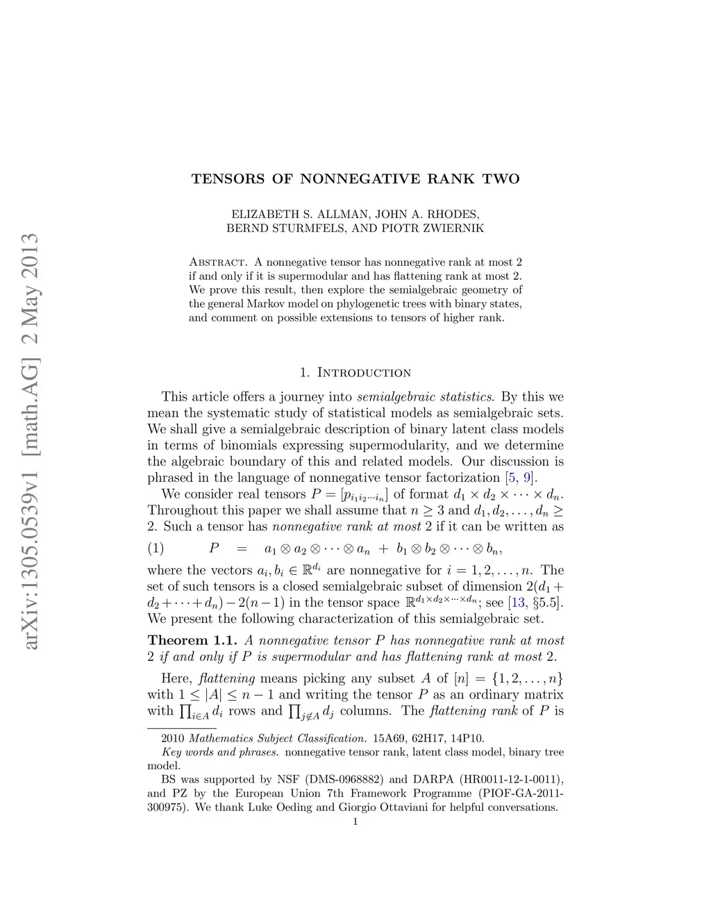 A nonnegative tensor has nonnegative rank at most 2 if and only if it is supermodular and has flattening rank at most 2. We prove this result, then explore the semialgebraic geometry of the general Markov model on phylogenetic trees with binary states, and comment on possible extensions to tensors of higher rank.