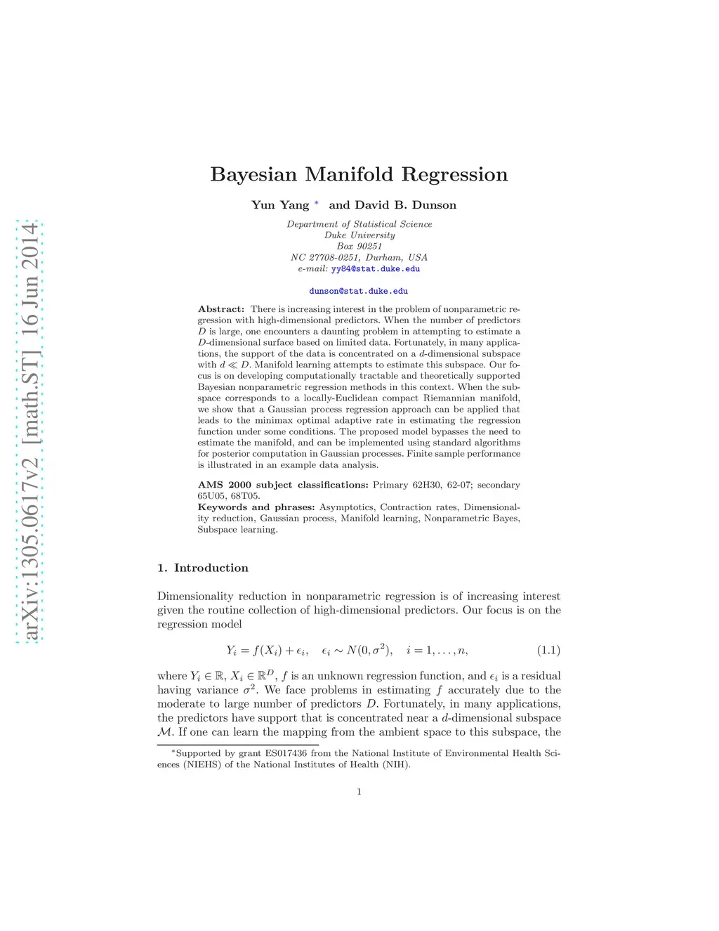 There is increasing interest in the problem of nonparametric regression with high-dimensional predictors. When the number of predictors is large, one encounters a daunting problem in attempting to estimate a -dimensional surface based on limited data. Fortunately, in many applications, the support of the data is concentrated on a -dimensional subspace with . Manifold learning attempts to estimate this subspace. Our focus is on developing computationally tractable and theoretically supported Bayesian nonparametric regression methods in this context. When the subspace corresponds to a locally-Euclidean Riemannian manifold, we show that a Gaussian process regression approach can be applied that leads to the minimax optimal adaptive rate in estimating the regression function under some conditions. The proposed model bypasses the need to estimate the manifold, and can be implemented using standard algorithms for posterior computation in Gaussian processes. Finite sample performance is illustrated in an example data analysis.