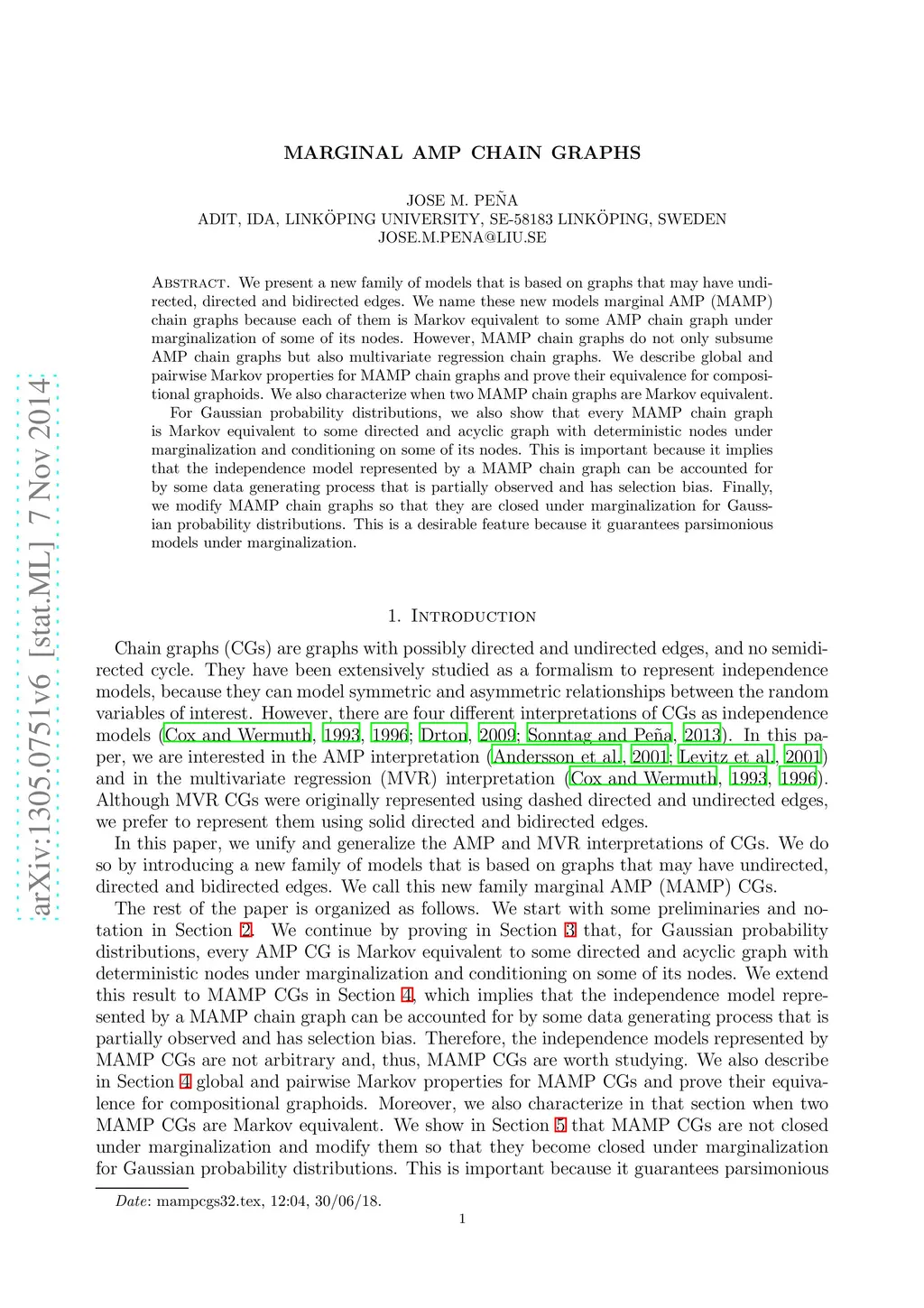 We present a new family of models that is based on graphs that may have undirected, directed and bidirected edges. We name these new models marginal AMP (MAMP) chain graphs because each of them is Markov equivalent to some AMP chain graph under marginalization of some of its nodes. However, MAMP chain graphs do not only subsume AMP chain graphs but also multivariate regression chain graphs. We describe global and pairwise Markov properties for MAMP chain graphs and prove their equivalence for compositional graphoids. We also characterize when two MAMP chain graphs are Markov equivalent. For Gaussian probability distributions, we also show that every MAMP chain graph is Markov equivalent to some directed and acyclic graph with deterministic nodes under marginalization and conditioning on some of its nodes. This is important because it implies that the independence model represented by a MAMP chain graph can be accounted for by some data generating process that is partially observed and has selection bias. Finally, we modify MAMP chain graphs so that they are closed under marginalization for Gaussian probability distributions. This is a desirable feature because it guarantees parsimonious models under marginalization.