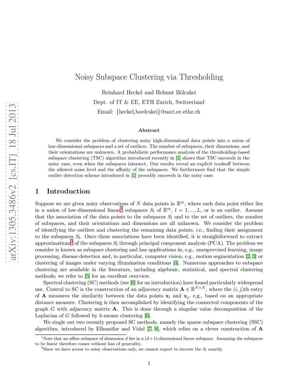 We consider the problem of clustering noisy high-dimensional data points into a union of low-dimensional subspaces and a set of outliers. The number of subspaces, their dimensions, and their orientations are unknown. A probabilistic performance analysis of the thresholding-based subspace clustering (TSC) algorithm introduced recently in [1] shows that TSC succeeds in the noisy case, even when the subspaces intersect. Our results reveal an explicit tradeoff between the allowed noise level and the affinity of the subspaces. We furthermore find that the simple outlier detection scheme introduced in [1] provably succeeds in the noisy case.