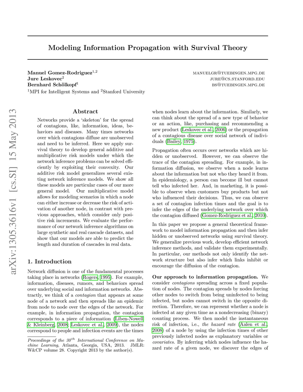 Networks provide a skeleton for the spread of contagions, like, information, ideas, behaviors and diseases. Many times networks over which contagions diffuse are unobserved and need to be inferred. Here we apply survival theory to develop general additive and multiplicative risk models under which the network inference problems can be solved efficiently by exploiting their convexity. Our additive risk model generalizes several existing network inference models. We show all these models are particular cases of our more general model. Our multiplicative model allows for modeling scenarios in which a node can either increase or decrease the risk of activation of another node, in contrast with previous approaches, which consider only positive risk increments. We evaluate the performance of our network inference algorithms on large synthetic and real cascade datasets, and show that our models are able to predict the length and duration of cascades in real data.