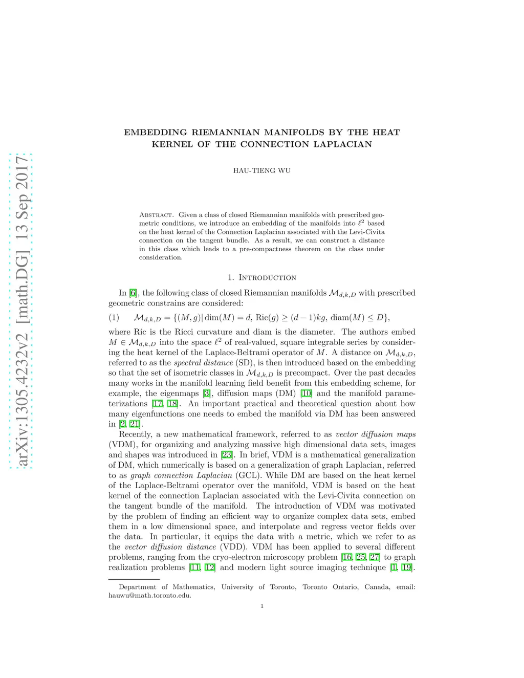 Given a class of closed Riemannian manifolds with prescribed geometric conditions, we introduce an embedding of the manifolds into based on the heat kernel of the Connection Laplacian associated with the Levi-Civita connection on the tangent bundle. As a result, we can construct a distance in this class which leads to a pre-compactness theorem on the class under consideration.