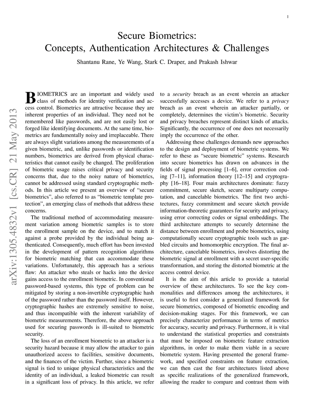 Secure Biometrics: Concepts, Authentication Architectures and Challenges