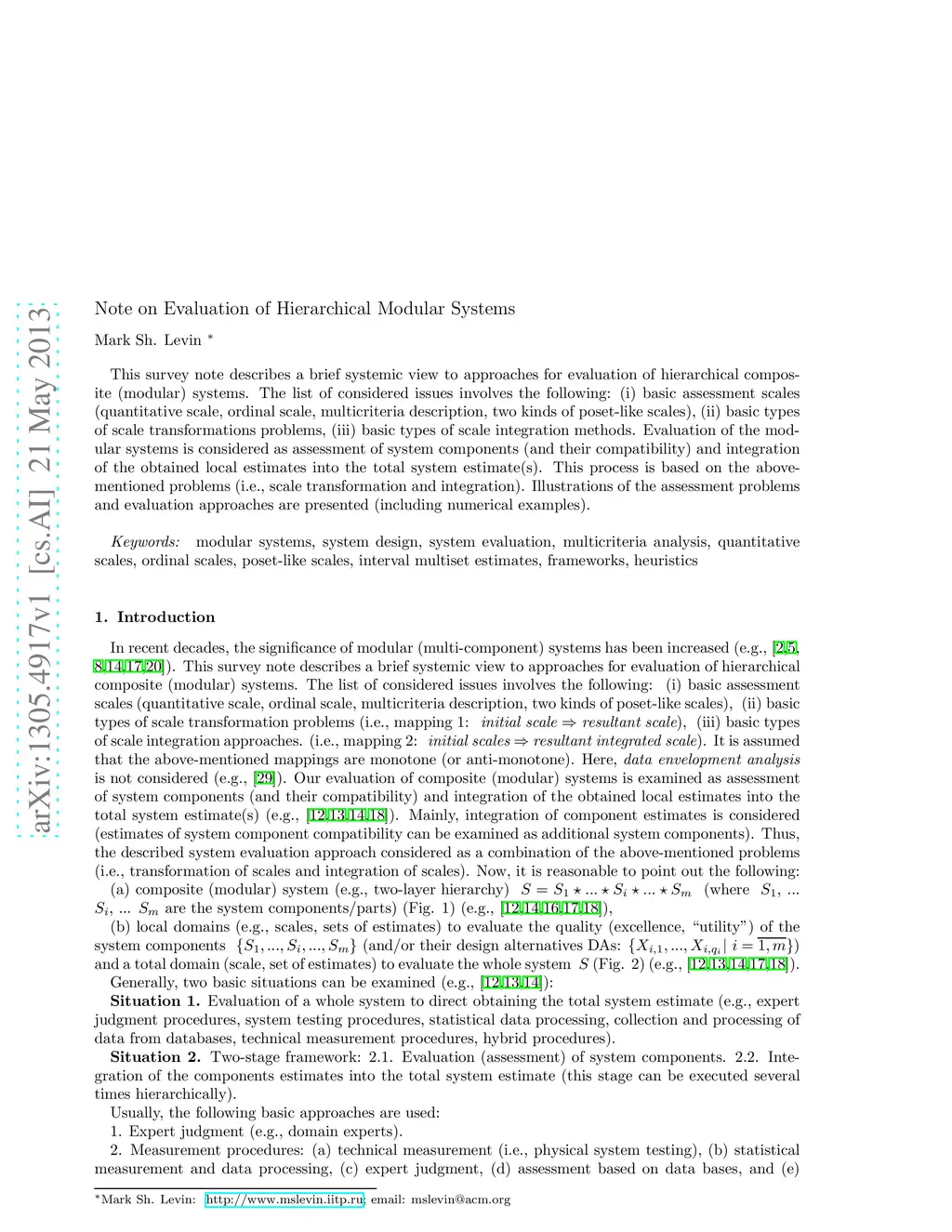 This survey note describes a brief systemic view to approaches for evaluation of hierarchical composite (modular) systems. The list of considered issues involves the following: (i) basic assessment scales (quantitative scale, ordinal scale, multicriteria description, two kinds of poset-like scales), (ii) basic types of scale transformations problems, (iii) basic types of scale integration methods. Evaluation of the modular systems is considered as assessment of system components (and their compatibility) and integration of the obtained local estimates into the total system estimate(s). This process is based on the above-mentioned problems (i.e., scale transformation and integration). Illustrations of the assessment problems and evaluation approaches are presented (including numerical examples).