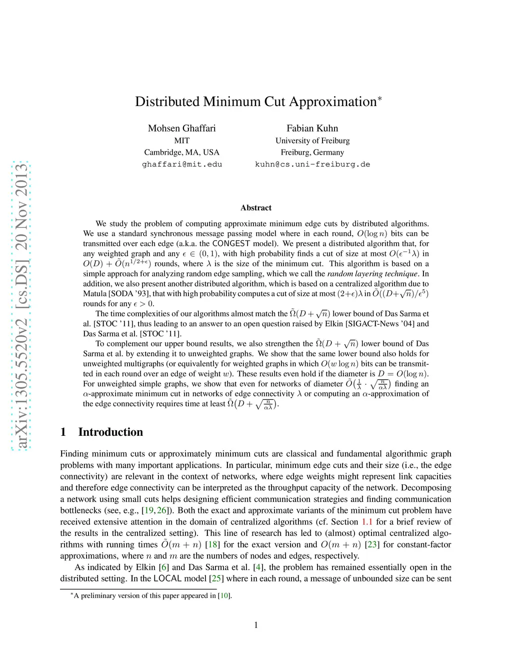 We study the problem of computing approximate minimum edge cuts by distributed algorithms. We present two randomized approximation algorithms that both run in a standard synchronous message passing model where in each round, bits can be transmitted over every edge (a.k.a. the CONGEST model). The first algorithm is based on a simple and new approach for analyzing random edge sampling, which we call random layering technique. For any any weighted graph and any , the algorithm finds a cut of size at most in rounds, where is the minimum-cut size and the -notation hides poly-logarithmic factors in . In addition, using the outline of a centralized algorithm due to Matula [SODA '93], we present a randomized algorithm to compute a cut of size at most in rounds for any . The time complexities of our algorithms almost match the lower bound of Das Sarma et al. [STOC '11], thus leading to an answer to an open question raised by Elkin [SIGACT-News '04] and Das Sarma et al. [STOC '11]. To complement our upper bound results, we also strengthen the lower bound of Das Sarma et al. by extending it to unweighted graphs. We show that the same lower bound also holds for unweighted multigraphs (or equivalently for weighted graphs in which bits can be transmitted in each round over an edge of weight ). For unweighted simple graphs, we show that computing an -approximate minimum cut requires time at least .