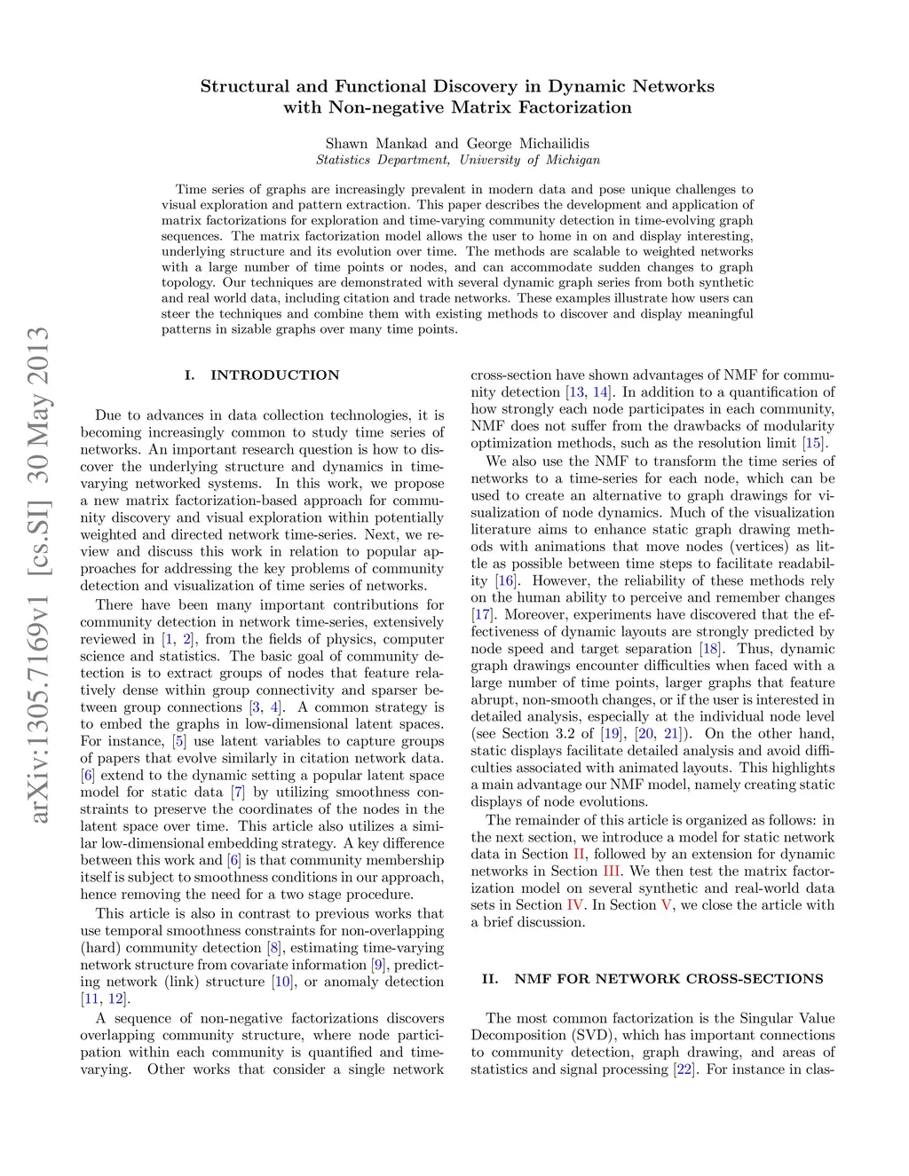 Time series of graphs are increasingly prevalent in modern data and pose unique challenges to visual exploration and pattern extraction. This paper describes the development and application of matrix factorizations for exploration and time-varying community detection in time-evolving graph sequences. The matrix factorization model allows the user to home in on and display interesting, underlying structure and its evolution over time. The methods are scalable to weighted networks with a large number of time points or nodes, and can accommodate sudden changes to graph topology. Our techniques are demonstrated with several dynamic graph series from both synthetic and real world data, including citation and trade networks. These examples illustrate how users can steer the techniques and combine them with existing methods to discover and display meaningful patterns in sizable graphs over many time points.