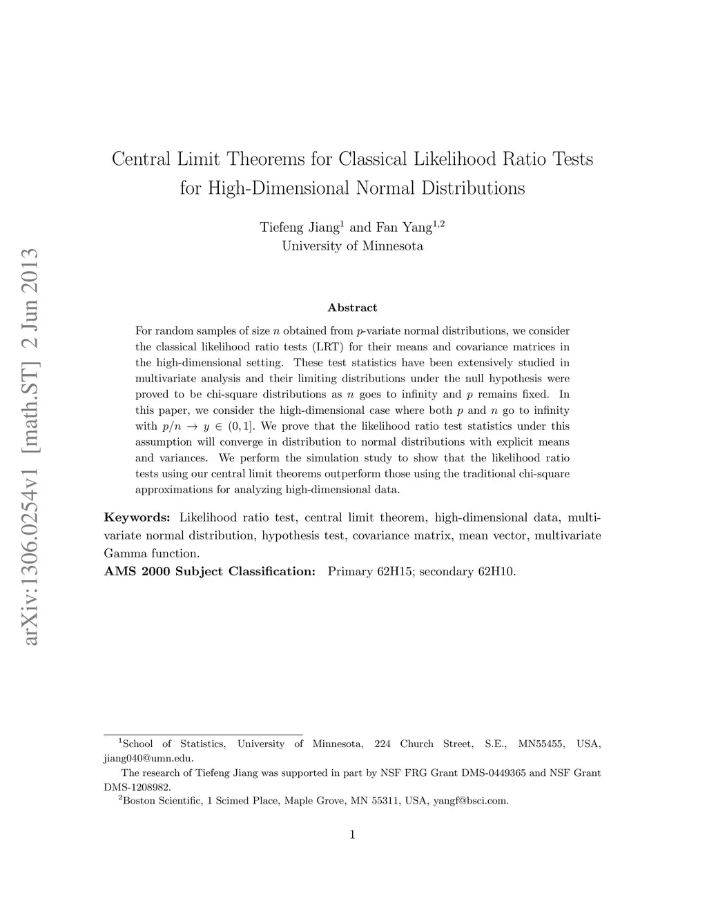For random samples of size n obtained from p-variate normal distributions, we consider the classical likelihood ratio tests (LRT) for their means and covariance matrices in the high-dimensional setting. These test statistics have been extensively studied in multivariate analysis and their limiting distributions under the null hypothesis were proved to be chi-square distributions as n goes to infinity and p remains fixed. In this paper, we consider the high-dimensional case where both p and n go to infinity with p=n/y in (0, 1]. We prove that the likelihood ratio test statistics under this assumption will converge in distribution to normal distributions with explicit means and variances. We perform the simulation study to show that the likelihood ratio tests using our central limit theorems outperform those using the traditional chi-square approximations for analyzing high-dimensional data.