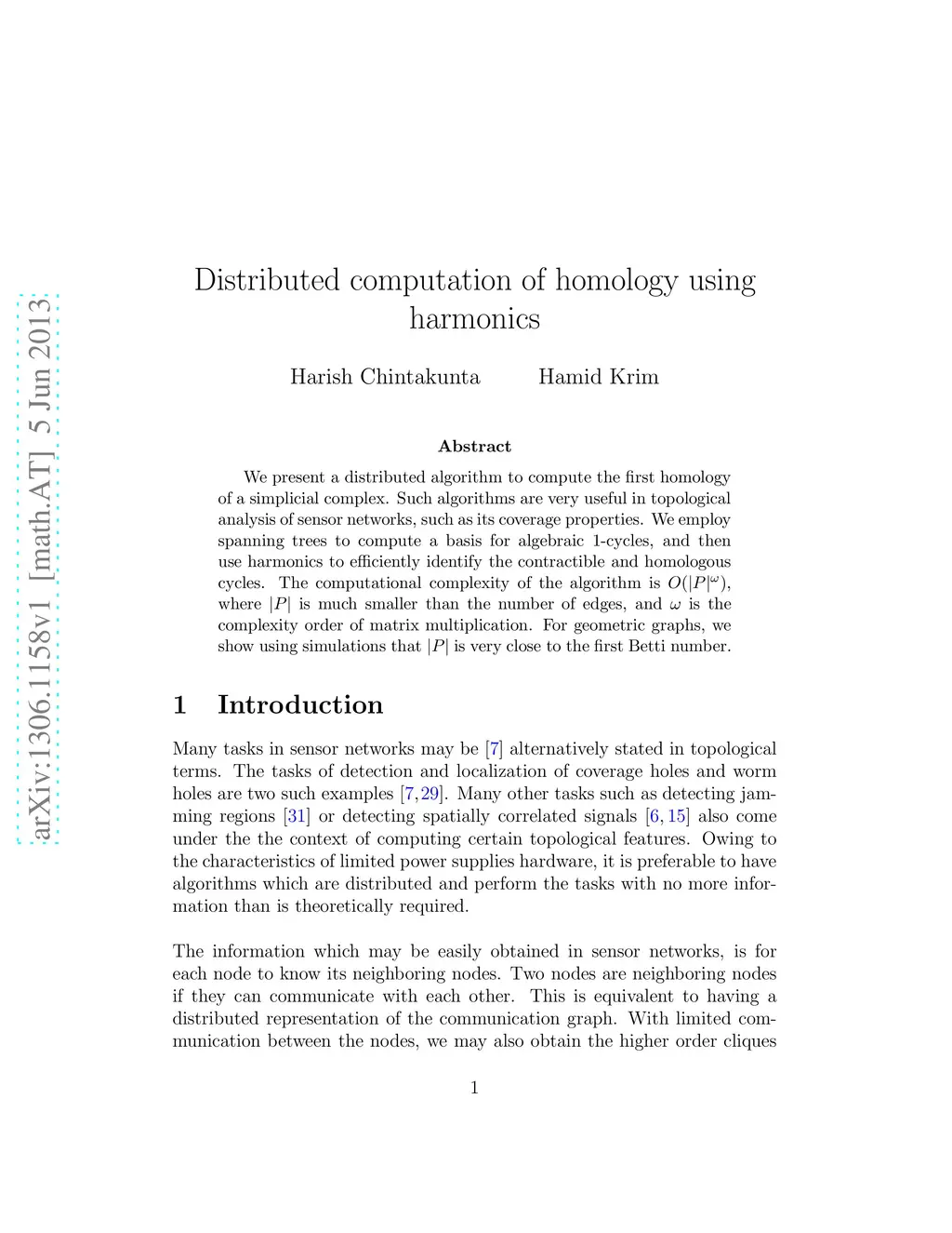 We present a distributed algorithm to compute the first homology of a simplicial complex. Such algorithms are very useful in topological analysis of sensor networks, such as its coverage properties. We employ spanning trees to compute a basis for algebraic 1-cycles, and then use harmonics to efficiently identify the contractible and homologous cycles. The computational complexity of the algorithm is , where is much smaller than the number of edges, and is the complexity order of matrix multiplication. For geometric graphs, we show using simulations that is very close to the first Betti number.
