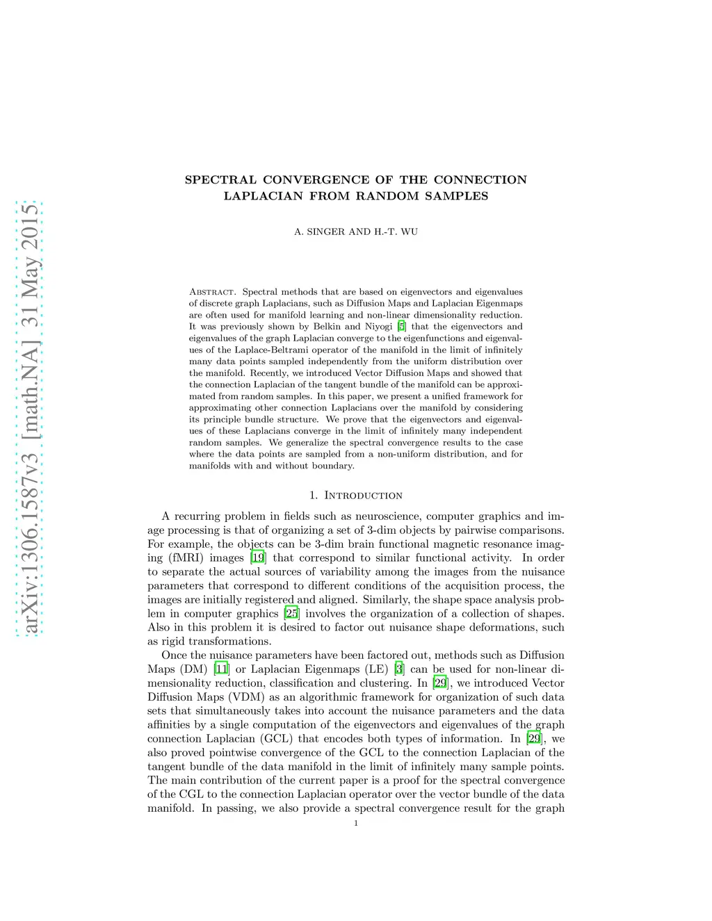 Spectral methods that are based on eigenvectors and eigenvalues of discrete graph Laplacians, such as Diffusion Maps and Laplacian Eigenmaps are often used for manifold learning and non-linear dimensionality reduction. It was previously shown by Belkin and Niyogi \cite{belkin_niyogi:2007} that the eigenvectors and eigenvalues of the graph Laplacian converge to the eigenfunctions and eigenvalues of the Laplace-Beltrami operator of the manifold in the limit of infinitely many data points sampled independently from the uniform distribution over the manifold. Recently, we introduced Vector Diffusion Maps and showed that the connection Laplacian of the tangent bundle of the manifold can be approximated from random samples. In this paper, we present a unified framework for approximating other connection Laplacians over the manifold by considering its principle bundle structure. We prove that the eigenvectors and eigenvalues of these Laplacians converge in the limit of infinitely many independent random samples. We generalize the spectral convergence results to the case where the data points are sampled from a non-uniform distribution, and for manifolds with and without boundary.