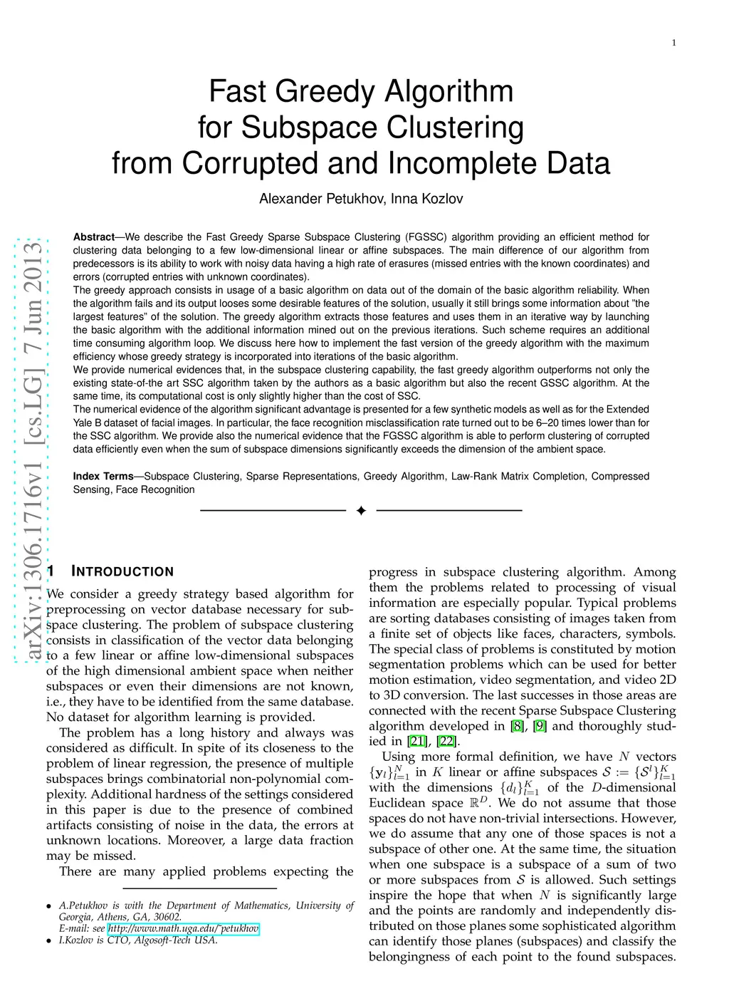 We describe the Fast Greedy Sparse Subspace Clustering (FGSSC) algorithm providing an efficient method for clustering data belonging to a few low-dimensional linear or affine subspaces. The main difference of our algorithm from predecessors is its ability to work with noisy data having a high rate of erasures (missed entries with the known coordinates) and errors (corrupted entries with unknown coordinates). We discuss here how to implement the fast version of the greedy algorithm with the maximum efficiency whose greedy strategy is incorporated into iterations of the basic algorithm. We provide numerical evidences that, in the subspace clustering capability, the fast greedy algorithm outperforms not only the existing state-of-the art SSC algorithm taken by the authors as a basic algorithm but also the recent GSSC algorithm. At the same time, its computational cost is only slightly higher than the cost of SSC. The numerical evidence of the algorithm significant advantage is presented for a few synthetic models as well as for the Extended Yale B dataset of facial images. In particular, the face recognition misclassification rate turned out to be 6-20 times lower than for the SSC algorithm. We provide also the numerical evidence that the FGSSC algorithm is able to perform clustering of corrupted data efficiently even when the sum of subspace dimensions significantly exceeds the dimension of the ambient space.