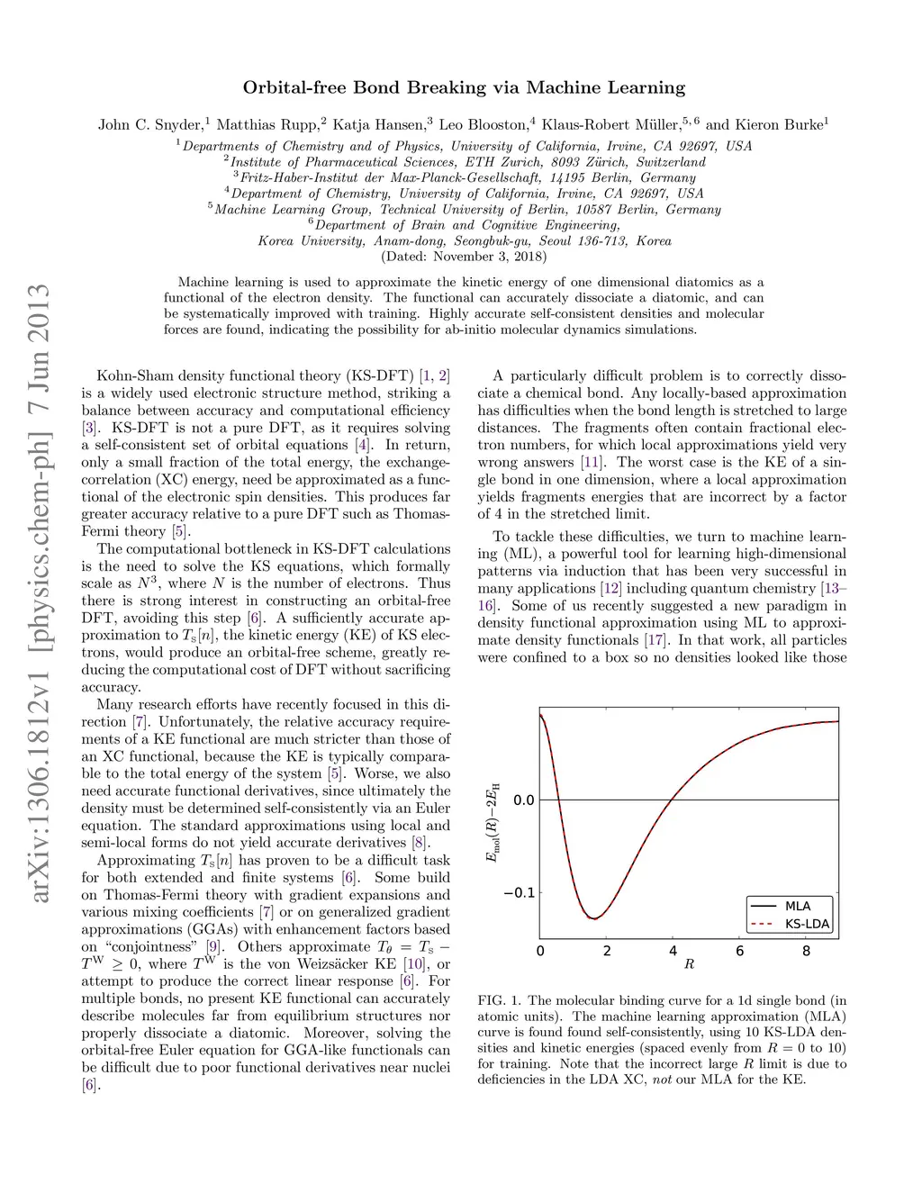 Machine learning is used to approximate the kinetic energy of one dimensional diatomics as a functional of the electron density. The functional can accurately dissociate a diatomic, and can be systematically improved with training. Highly accurate self-consistent densities and molecular forces are found, indicating the possibility for ab-initio molecular dynamics simulations.
