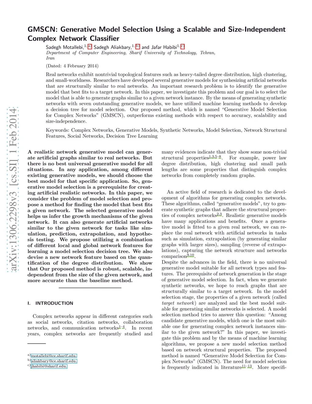 Real networks exhibit nontrivial topological features such as heavy-tailed degree distribution, high clustering, and small-worldness. Researchers have developed several generative models for synthesizing artificial networks that are structurally similar to real networks. An important research problem is to identify the generative model that best fits to a target network. In this paper, we investigate this problem and our goal is to select the model that is able to generate graphs similar to a given network instance. By the means of generating synthetic networks with seven outstanding generative models, we have utilized machine learning methods to develop a decision tree for model selection. Our proposed method, which is named "Generative Model Selection for Complex Networks" (GMSCN), outperforms existing methods with respect to accuracy, scalability and size-independence.