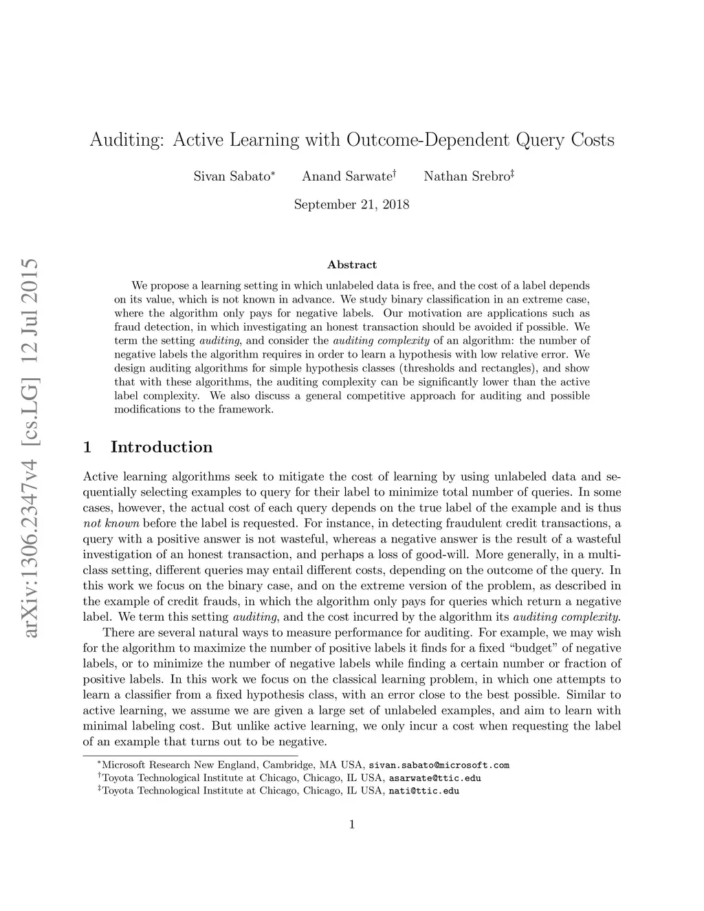 We propose a learning setting in which unlabeled data is free, and the cost of a label depends on its value, which is not known in advance. We study binary classification in an extreme case, where the algorithm only pays for negative labels. Our motivation are applications such as fraud detection, in which investigating an honest transaction should be avoided if possible. We term the setting auditing, and consider the auditing complexity of an algorithm: the number of negative labels the algorithm requires in order to learn a hypothesis with low relative error. We design auditing algorithms for simple hypothesis classes (thresholds and rectangles), and show that with these algorithms, the auditing complexity can be significantly lower than the active label complexity. We also discuss a general competitive approach for auditing and possible modifications to the framework.