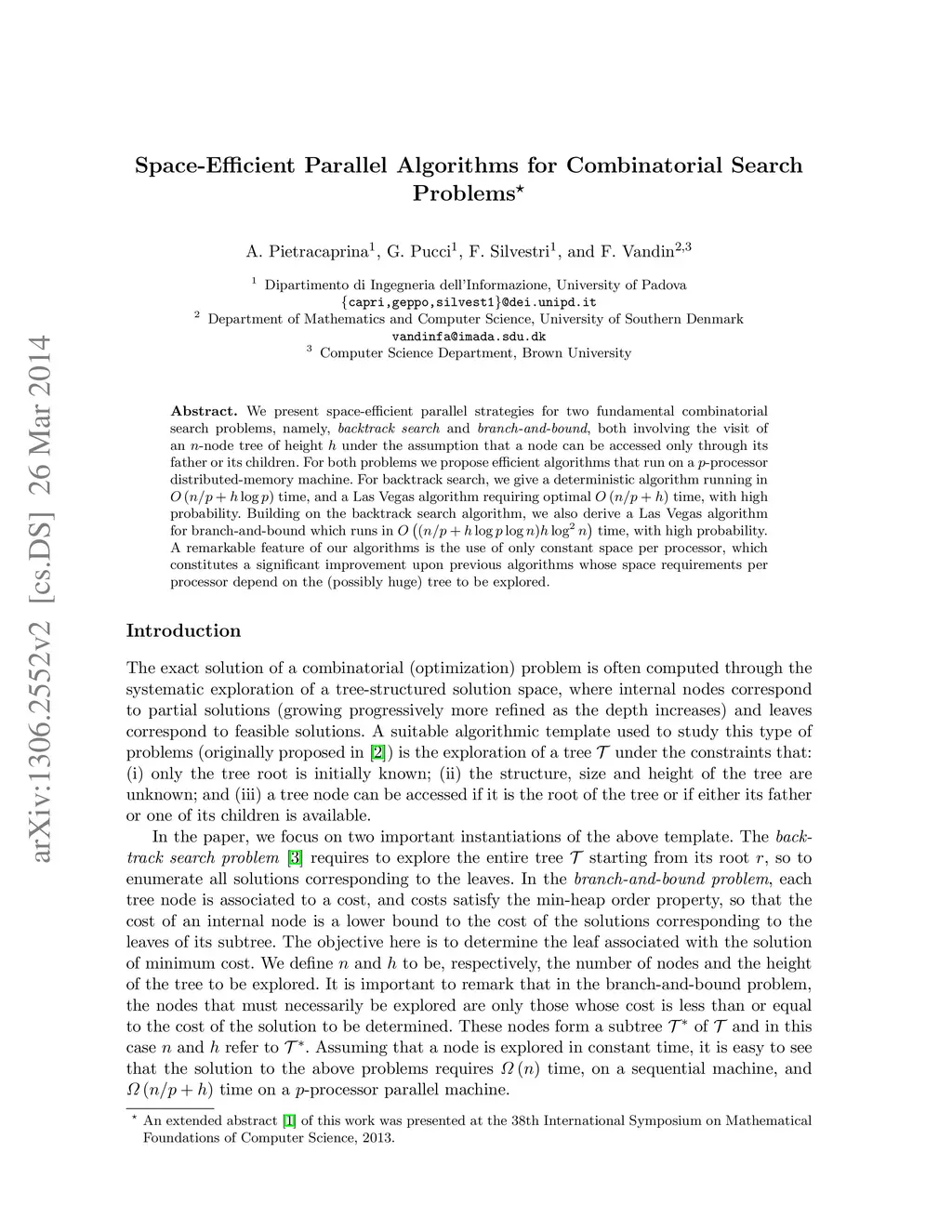 We present space-efficient parallel strategies for two fundamental combinatorial search problems, namely, backtrack search and branch-and-bound, both involving the visit of an -node tree of height under the assumption that a node can be accessed only through its father or its children. For both problems we propose efficient algorithms that run on a -processor distributed-memory machine. For backtrack search, we give a deterministic algorithm running in time, and a Las Vegas algorithm requiring optimal time, with high probability. Building on the backtrack search algorithm, we also derive a Las Vegas algorithm for branch-and-bound which runs in time, with high probability. A remarkable feature of our algorithms is the use of only constant space per processor, which constitutes a significant improvement upon previous algorithms whose space requirements per processor depend on the (possibly huge) tree to be explored.
