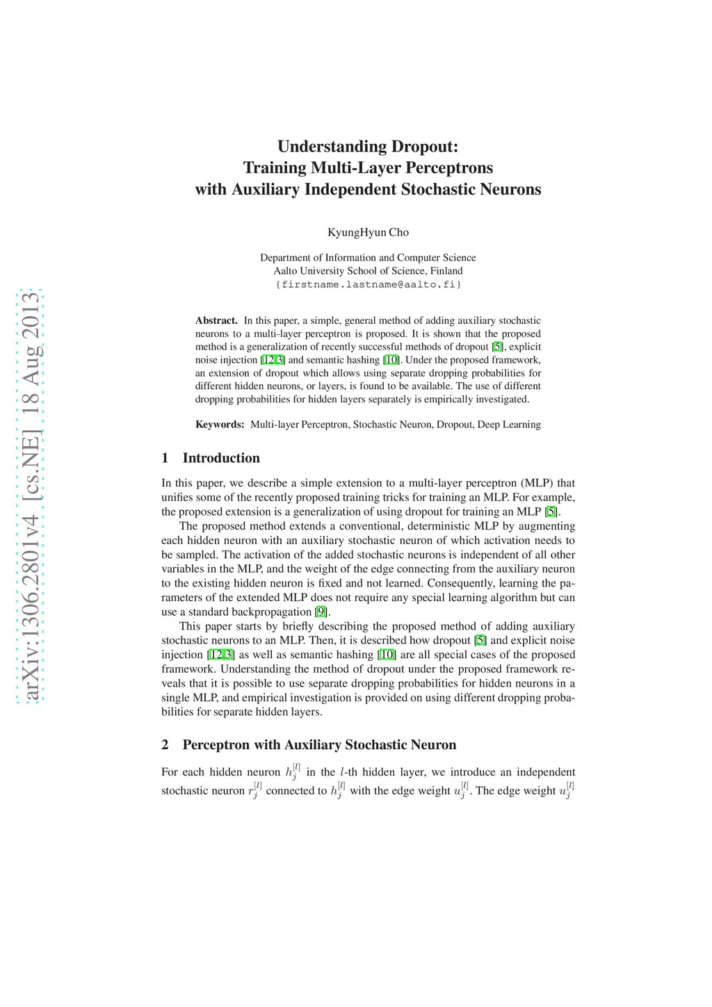 In this paper, a simple, general method of adding auxiliary stochastic neurons to a multi-layer perceptron is proposed. It is shown that the proposed method is a generalization of recently successful methods of dropout (Hinton et al., 2012), explicit noise injection (Vincent et al., 2010; Bishop, 1995) and semantic hashing (Salakhutdinov & Hinton, 2009). Under the proposed framework, an extension of dropout which allows using separate dropping probabilities for different hidden neurons, or layers, is found to be available. The use of different dropping probabilities for hidden layers separately is empirically investigated.