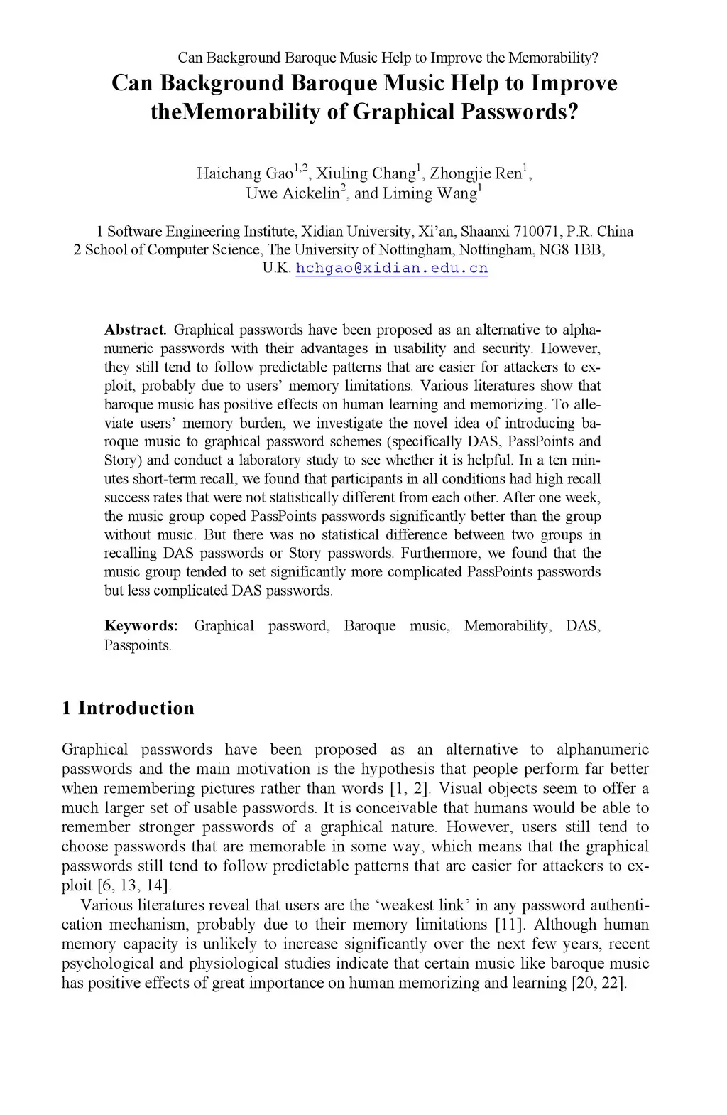 Graphical passwords have been proposed as an alternative to alphanumeric passwords with their advantages in usability and security. However, they still tend to follow predictable patterns that are easier for attackers to exploit, probably due to users' memory limitations. Various literatures show that baroque music has positive effects on human learning and memorizing. To alleviate users' memory burden, we investigate the novel idea of introducing baroque music to graphical password schemes (specifically DAS, PassPoints and Story) and conduct a laboratory study to see whether it is helpful. In a ten minutes short-term recall, we found that participants in all conditions had high recall success rates that were not statistically different from each other. After one week, the music group coped PassPoints passwords significantly better than the group without music. But there was no statistical difference between two groups in recalling DAS passwords or Story passwords. Further more, we found that the music group tended to set significantly more complicated PassPoints passwords but less complicated DAS passwords.