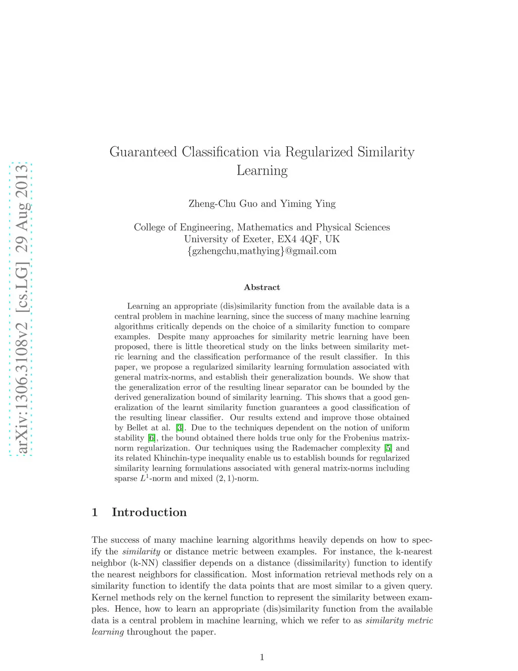 Learning an appropriate (dis)similarity function from the available data is a central problem in machine learning, since the success of many machine learning algorithms critically depends on the choice of a similarity function to compare examples. Despite many approaches for similarity metric learning have been proposed, there is little theoretical study on the links between similarity met- ric learning and the classification performance of the result classifier. In this paper, we propose a regularized similarity learning formulation associated with general matrix-norms, and establish their generalization bounds. We show that the generalization error of the resulting linear separator can be bounded by the derived generalization bound of similarity learning. This shows that a good gen- eralization of the learnt similarity function guarantees a good classification of the resulting linear classifier. Our results extend and improve those obtained by Bellet at al. [3]. Due to the techniques dependent on the notion of uniform stability [6], the bound obtained there holds true only for the Frobenius matrix- norm regularization. Our techniques using the Rademacher complexity [5] and its related Khinchin-type inequality enable us to establish bounds for regularized similarity learning formulations associated with general matrix-norms including sparse L 1 -norm and mixed (2,1)-norm.