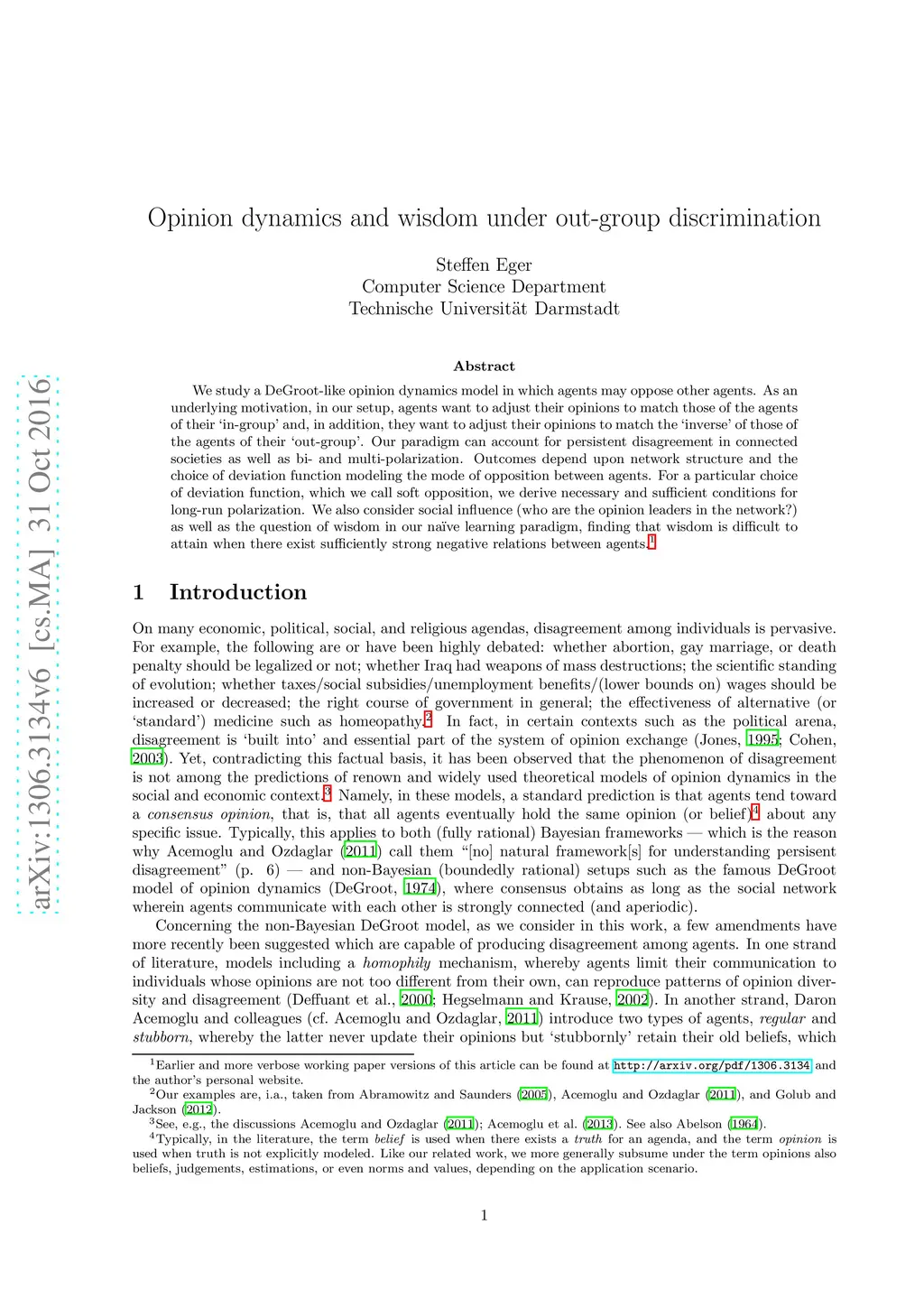 We study a DeGroot-like opinion dynamics model in which agents may oppose other agents. As an underlying motivation, in our setup, agents want to adjust their opinions to match those of the agents of their ín-group' and, in addition, they want to adjust their opinions to match the ínverse' of those of the agents of their óut-group'. Our paradigm can account for persistent disagreement in connected societies as well as bi- and multi-polarization. Outcomes depend upon network structure and the choice of deviation function modeling the mode of opposition between agents. For a particular choice of deviation function, which we call soft opposition, we derive necessary and sufficient conditions for long-run polarization. We also consider social influence (who are the opinion leaders in the network?) as well as the question of wisdom in our naive learning paradigm, finding that wisdom is difficult to attain when there exist sufficiently strong negative relations between agents.