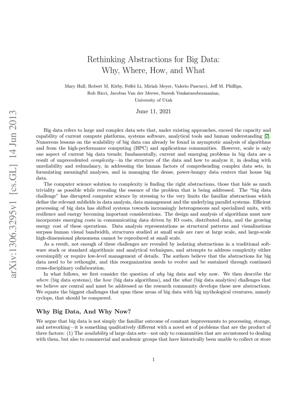 Big data refers to large and complex data sets that, under existing approaches, exceed the capacity and capability of current compute platforms, systems software, analytical tools and human understanding. Numerous lessons on the scalability of big data can already be found in asymptotic analysis of algorithms and from the high-performance computing (HPC) and applications communities. However, scale is only one aspect of current big data trends; fundamentally, current and emerging problems in big data are a result of unprecedented complexity--in the structure of the data and how to analyze it, in dealing with unreliability and redundancy, in addressing the human factors of comprehending complex data sets, in formulating meaningful analyses, and in managing the dense, power-hungry data centers that house big data. The computer science solution to complexity is finding the right abstractions, those that hide as much triviality as possible while revealing the essence of the problem that is being addressed. The "big data challenge" has disrupted computer science by stressing to the very limits the familiar abstractions which define the relevant subfields in data analysis, data management and the underlying parallel systems. As a result, not enough of these challenges are revealed by isolating abstractions in a traditional software stack or standard algorithmic and analytical techniques, and attempts to address complexity either oversimplify or require low-level management of details. The authors believe that the abstractions for big data need to be rethought, and this reorganization needs to evolve and be sustained through continued cross-disciplinary collaboration.