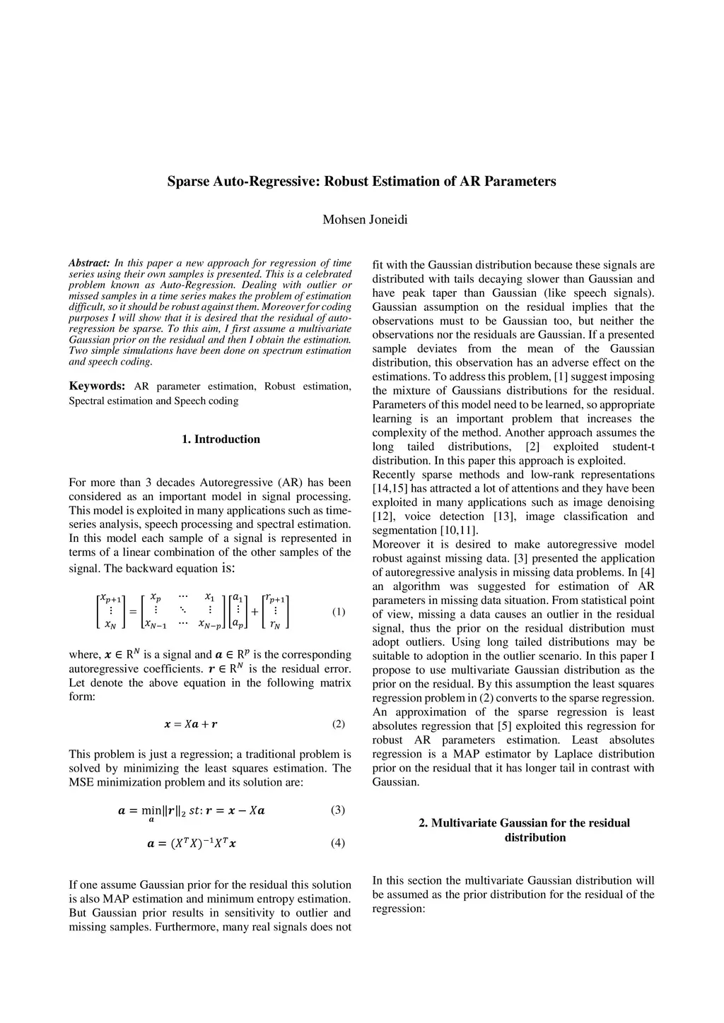 In this paper I present a new approach for regression of time series using their own samples. This is a celebrated problem known as Auto-Regression. Dealing with outlier or missed samples in a time series makes the problem of estimation difficult, so it should be robust against them. Moreover for coding purposes I will show that it is desired the residual of auto-regression be sparse. To these aims, I first assume a multivariate Gaussian prior on the residual and then obtain the estimation. Two simple simulations have been done on spectrum estimation and speech coding.