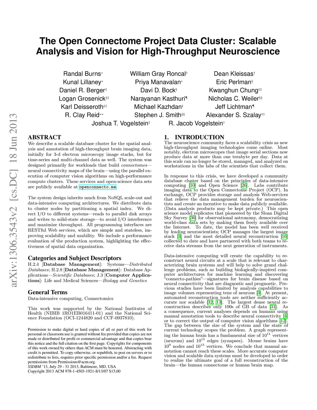 The Open Connectome Project Data Cluster: Scalable Analysis and Vision