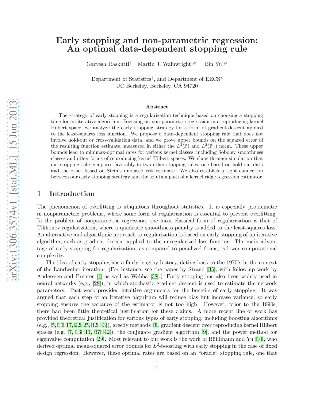 The strategy of early stopping is a regularization technique based on choosing a stopping time for an iterative algorithm. Focusing on non-parametric regression in a reproducing kernel Hilbert space, we analyze the early stopping strategy for a form of gradient-descent applied to the least-squares loss function. We propose a data-dependent stopping rule that does not involve hold-out or cross-validation data, and we prove upper bounds on the squared error of the resulting function estimate, measured in either the and norm. These upper bounds lead to minimax-optimal rates for various kernel classes, including Sobolev smoothness classes and other forms of reproducing kernel Hilbert spaces. We show through simulation that our stopping rule compares favorably to two other stopping rules, one based on hold-out data and the other based on Stein's unbiased risk estimate. We also establish a tight connection between our early stopping strategy and the solution path of a kernel ridge regression estimator.