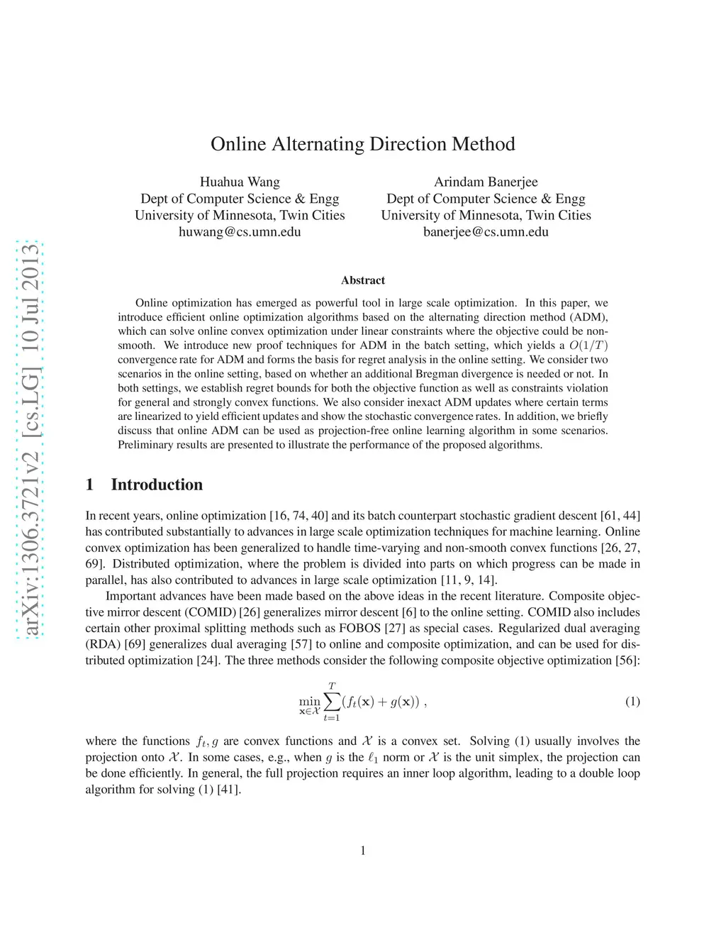 Online optimization has emerged as powerful tool in large scale optimization. In this pa- per, we introduce efficient online optimization algorithms based on the alternating direction method (ADM), which can solve online convex optimization under linear constraints where the objective could be non-smooth. We introduce new proof techniques for ADM in the batch setting, which yields a O(1/T) convergence rate for ADM and forms the basis for regret anal- ysis in the online setting. We consider two scenarios in the online setting, based on whether an additional Bregman divergence is needed or not. In both settings, we establish regret bounds for both the objective function as well as constraints violation for general and strongly convex functions. We also consider inexact ADM updates where certain terms are linearized to yield efficient updates and show the stochastic convergence rates. In addition, we briefly discuss that online ADM can be used as projection- free online learning algorithm in some scenarios. Preliminary results are presented to illustrate the performance of the proposed algorithms.