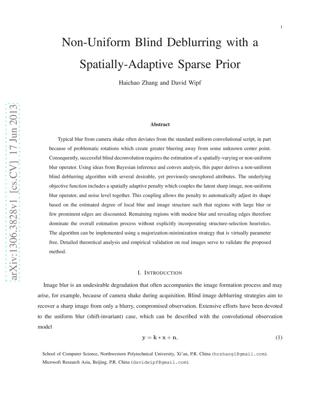 Typical blur from camera shake often deviates from the standard uniform convolutional script, in part because of problematic rotations which create greater blurring away from some unknown center point. Consequently, successful blind deconvolution requires the estimation of a spatially-varying or non-uniform blur operator. Using ideas from Bayesian inference and convex analysis, this paper derives a non-uniform blind deblurring algorithm with several desirable, yet previously-unexplored attributes. The underlying objective function includes a spatially adaptive penalty which couples the latent sharp image, non-uniform blur operator, and noise level together. This coupling allows the penalty to automatically adjust its shape based on the estimated degree of local blur and image structure such that regions with large blur or few prominent edges are discounted. Remaining regions with modest blur and revealing edges therefore dominate the overall estimation process without explicitly incorporating structure-selection heuristics. The algorithm can be implemented using a majorization-minimization strategy that is virtually parameter free. Detailed theoretical analysis and empirical validation on real images serve to validate the proposed method.