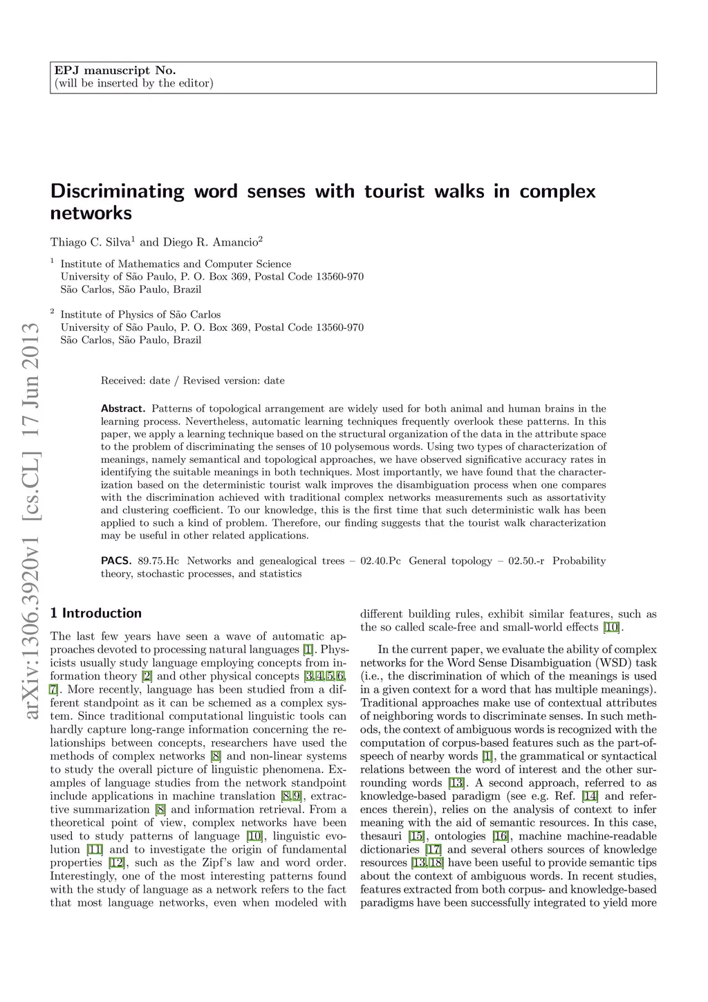 Patterns of topological arrangement are widely used for both animal and human brains in the learning process. Nevertheless, automatic learning techniques frequently overlook these patterns. In this paper, we apply a learning technique based on the structural organization of the data in the attribute space to the problem of discriminating the senses of 10 polysemous words. Using two types of characterization of meanings, namely semantical and topological approaches, we have observed significative accuracy rates in identifying the suitable meanings in both techniques. Most importantly, we have found that the characterization based on the deterministic tourist walk improves the disambiguation process when one compares with the discrimination achieved with traditional complex networks measurements such as assortativity and clustering coefficient. To our knowledge, this is the first time that such deterministic walk has been applied to such a kind of problem. Therefore, our finding suggests that the tourist walk characterization may be useful in other related applications.