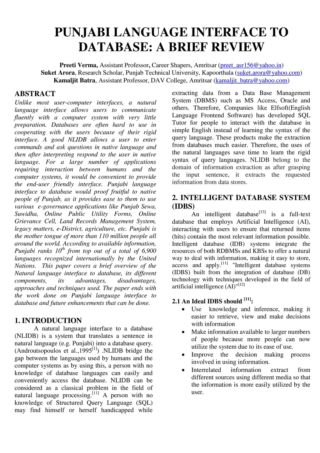 Punjabi Language Interface to Database: a brief review