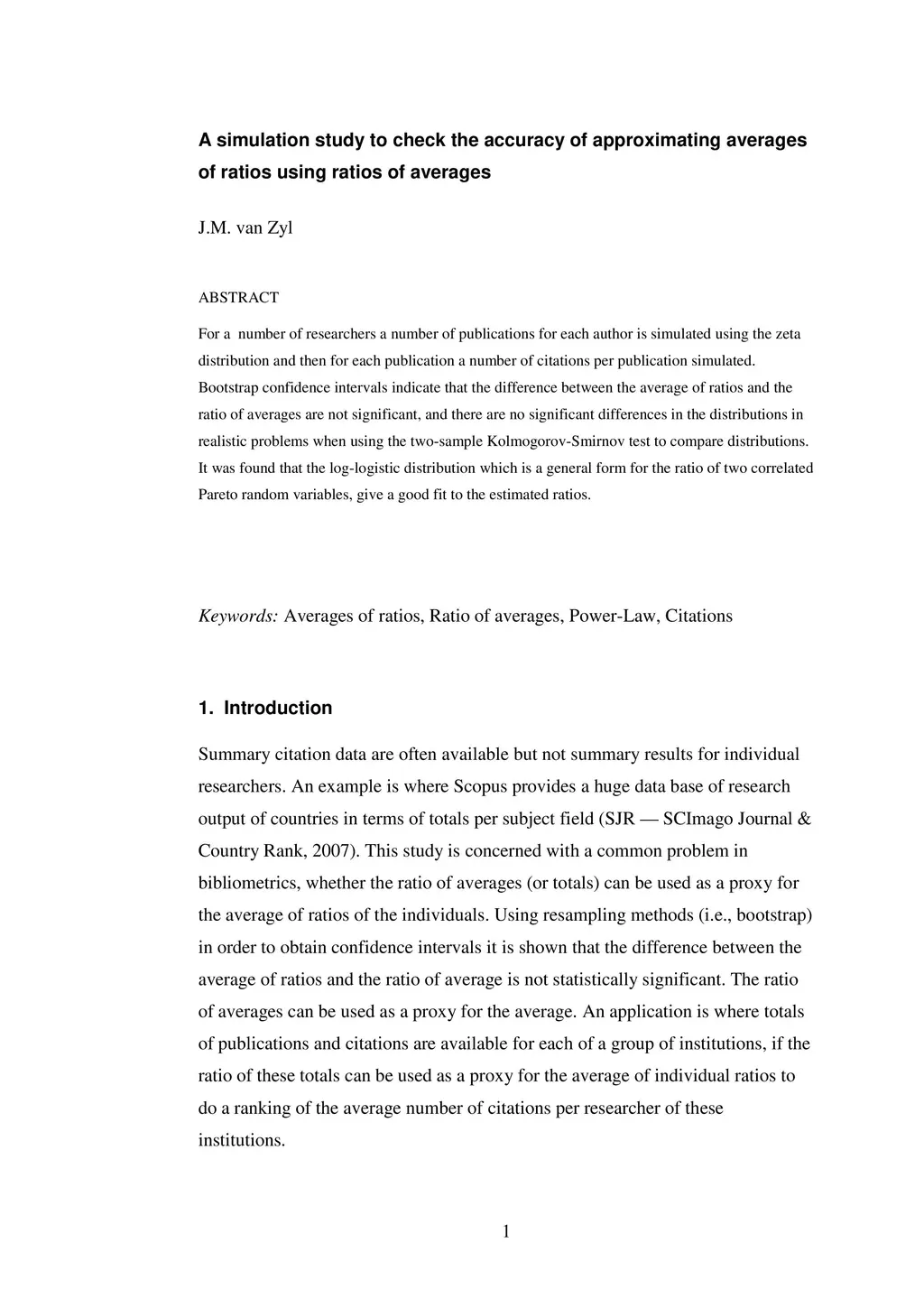For a number of researchers a number of publications for each author is simulated using the zeta distribution and then for each publication a number of citations per publication simulated. Bootstrap confidence intervals indicate that the difference between the average of ratios and the ratio of averages are not significant, and there are no significant differences in the distributions in realistic problems when using the two-sample Kolmogorov-Smirnov test to compare distributions. It was found that the log-logistic distribution which is a general form for the ratio of two correlated Pareto random variables, give a good fit to the estimated ratios.