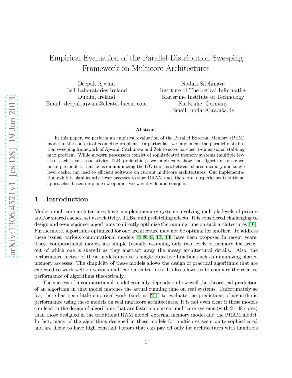 In this paper, we perform an empirical evaluation of the Parallel External Memory (PEM) model in the context of geometric problems. In particular, we implement the parallel distribution sweeping framework of Ajwani, Sitchinava and Zeh to solve batched 1-dimensional stabbing max problem. While modern processors consist of sophisticated memory systems (multiple levels of caches, set associativity, TLB, prefetching), we empirically show that algorithms designed in simple models, that focus on minimizing the I/O transfers between shared memory and single level cache, can lead to efficient software on current multicore architectures. Our implementation exhibits significantly fewer accesses to slow DRAM and, therefore, outperforms traditional approaches based on plane sweep and two-way divide and conquer.