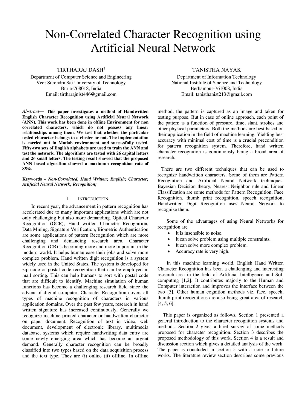Non-Correlated Character Recognition using Artificial Neural Network