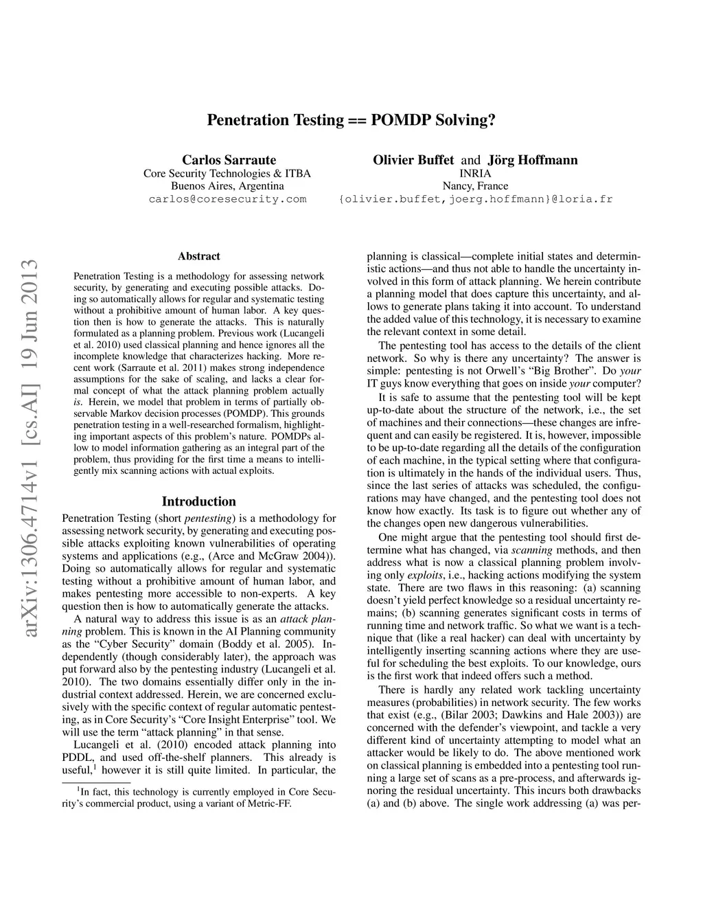 Penetration Testing is a methodology for assessing network security, by generating and executing possible attacks. Doing so automatically allows for regular and systematic testing without a prohibitive amount of human labor. A key question then is how to generate the attacks. This is naturally formulated as a planning problem. Previous work (Lucangeli et al. 2010) used classical planning and hence ignores all the incomplete knowledge that characterizes hacking. More recent work (Sarraute et al. 2011) makes strong independence assumptions for the sake of scaling, and lacks a clear formal concept of what the attack planning problem actually is. Herein, we model that problem in terms of partially observable Markov decision processes (POMDP). This grounds penetration testing in a well-researched formalism, highlighting important aspects of this problem's nature. POMDPs allow to model information gathering as an integral part of the problem, thus providing for the first time a means to intelligently mix scanning actions with actual exploits.