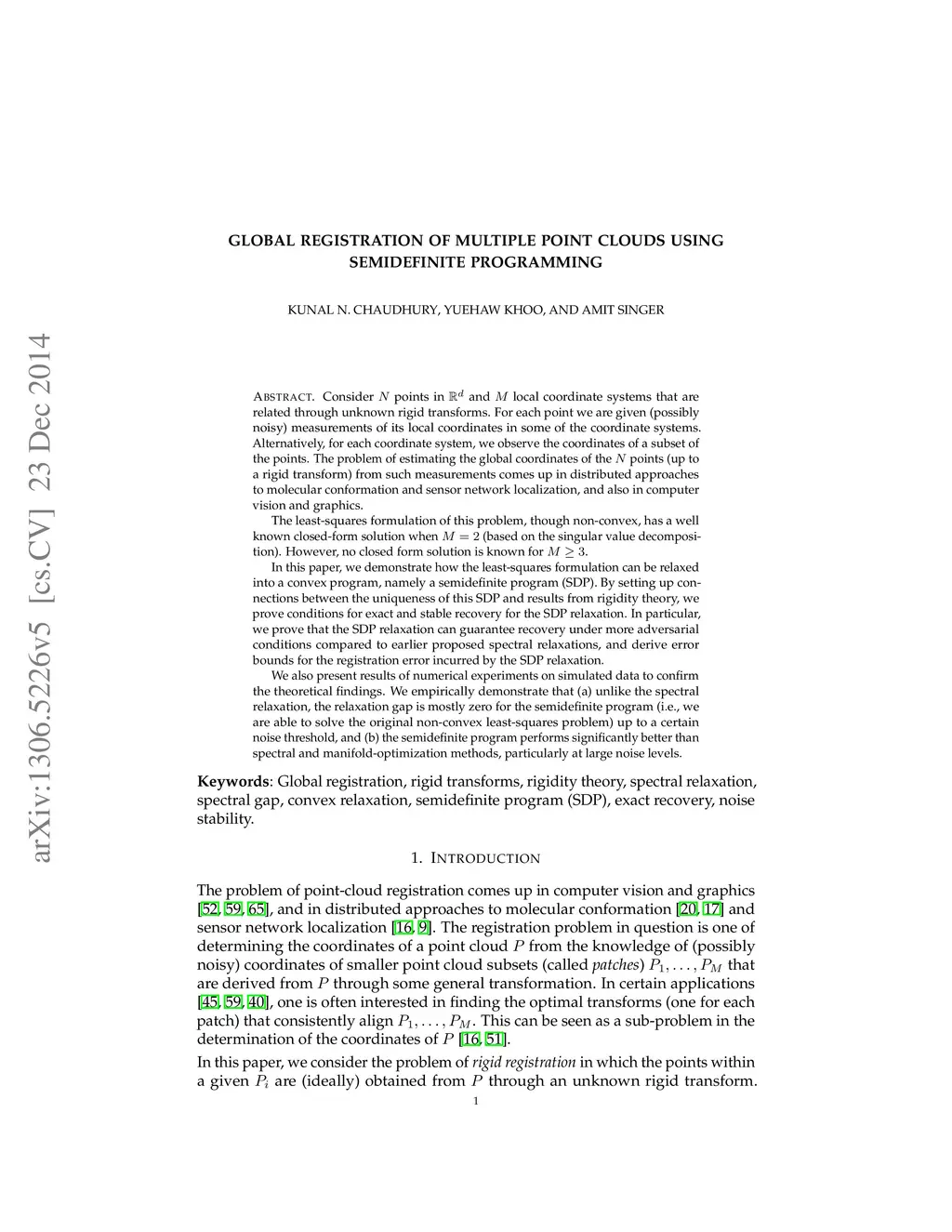 Consider points in and local coordinate systems that are related through unknown rigid transforms. For each point we are given (possibly noisy) measurements of its local coordinates in some of the coordinate systems. Alternatively, for each coordinate system, we observe the coordinates of a subset of the points. The problem of estimating the global coordinates of the points (up to a rigid transform) from such measurements comes up in distributed approaches to molecular conformation and sensor network localization, and also in computer vision and graphics. The least-squares formulation of this problem, though non-convex, has a well known closed-form solution when (based on the singular value decomposition). However, no closed form solution is known for . In this paper, we demonstrate how the least-squares formulation can be relaxed into a convex program, namely a semidefinite program (SDP). By setting up connections between the uniqueness of this SDP and results from rigidity theory, we prove conditions for exact and stable recovery for the SDP relaxation. In particular, we prove that the SDP relaxation can guarantee recovery under more adversarial conditions compared to earlier proposed spectral relaxations, and derive error bounds for the registration error incurred by the SDP relaxation. We also present results of numerical experiments on simulated data to confirm the theoretical findings. We empirically demonstrate that (a) unlike the spectral relaxation, the relaxation gap is mostly zero for the semidefinite program (i.e., we are able to solve the original non-convex least-squares problem) up to a certain noise threshold, and (b) the semidefinite program performs significantly better than spectral and manifold-optimization methods, particularly at large noise levels.