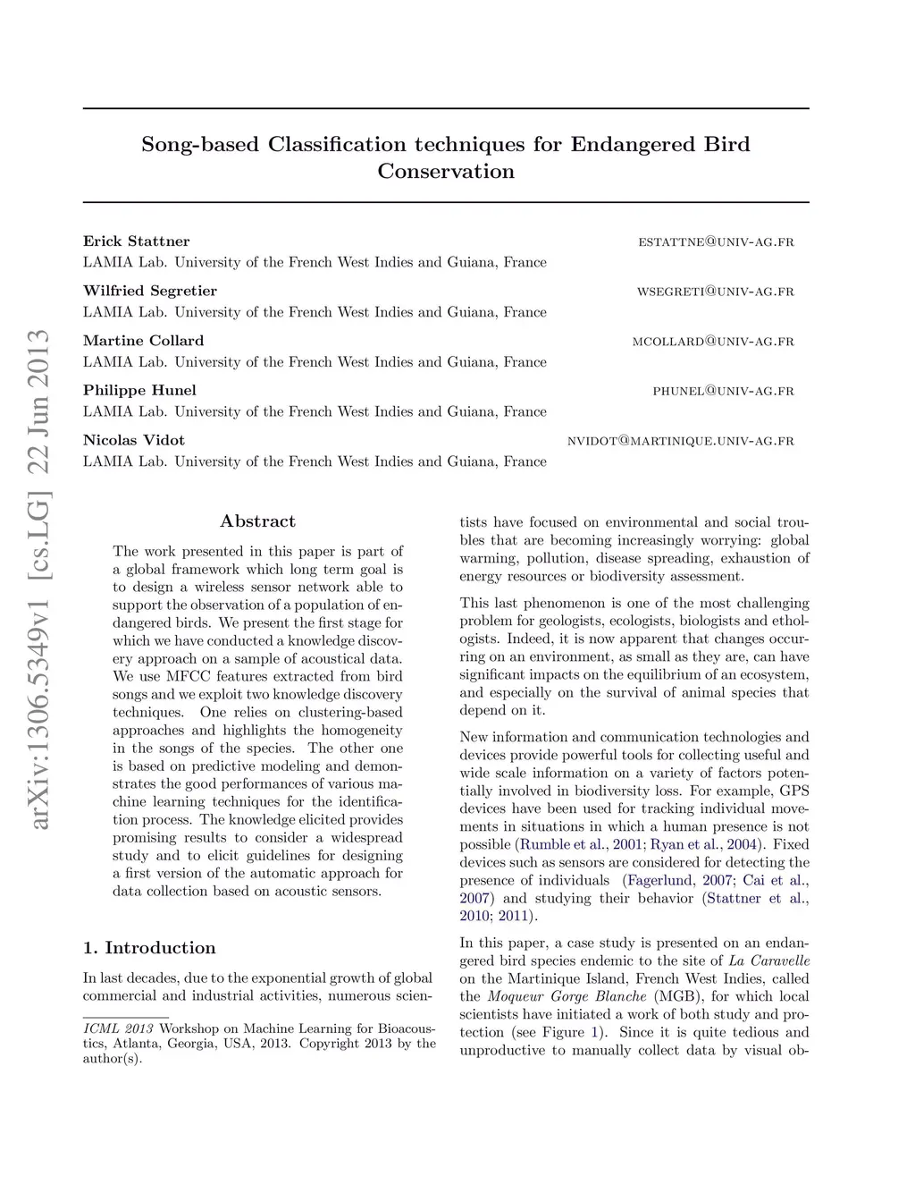The work presented in this paper is part of a global framework which long term goal is to design a wireless sensor network able to support the observation of a population of endangered birds. We present the first stage for which we have conducted a knowledge discovery approach on a sample of acoustical data. We use MFCC features extracted from bird songs and we exploit two knowledge discovery techniques. One that relies on clustering-based approaches, that highlights the homogeneity in the songs of the species. The other, based on predictive modeling, that demonstrates the good performances of various machine learning techniques for the identification process. The knowledge elicited provides promising results to consider a widespread study and to elicit guidelines for designing a first version of the automatic approach for data collection based on acoustic sensors.