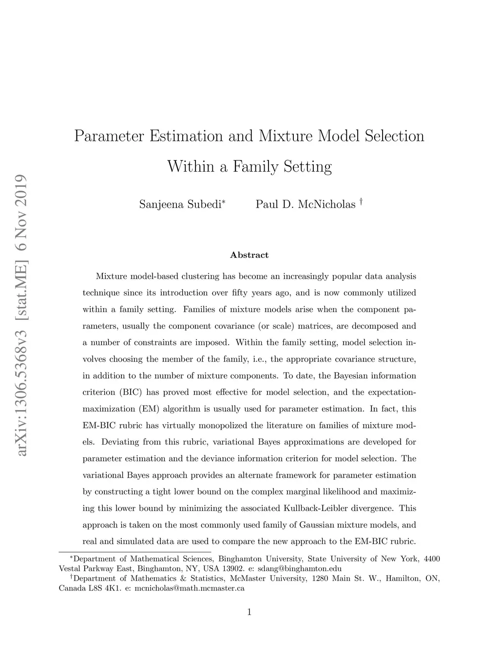 Mixture model-based clustering has become an increasingly popular data analysis technique since its introduction over fifty years ago, and is now commonly utilized within a family setting. Families of mixture models arise when the component parameters, usually the component covariance (or scale) matrices, are decomposed and a number of constraints are imposed. Within the family setting, model selection involves choosing the member of the family, i.e., the appropriate covariance structure, in addition to the number of mixture components. To date, the Bayesian information criterion (BIC) has proved most effective for model selection, and the expectation-maximization (EM) algorithm is usually used for parameter estimation. In fact, this EM-BIC rubric has virtually monopolized the literature on families of mixture models. Deviating from this rubric, variational Bayes approximations are developed for parameter estimation and the deviance information criterion for model selection. The variational Bayes approach provides an alternate framework for parameter estimation by constructing a tight lower bound on the complex marginal likelihood and maximizing this lower bound by minimizing the associated Kullback-Leibler divergence. This approach is taken on the most commonly used family of Gaussian mixture models, and real and simulated data are used to compare the new approach to the EM-BIC rubric.
