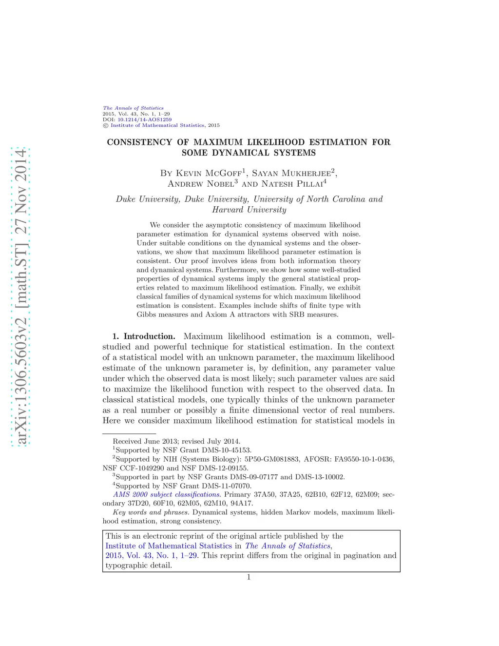 We consider the asymptotic consistency of maximum likelihood parameter estimation for dynamical systems observed with noise. Under suitable conditions on the dynamical systems and the observations, we show that maximum likelihood parameter estimation is consistent. Our proof involves ideas from both information theory and dynamical systems. Furthermore, we show how some well-studied properties of dynamical systems imply the general statistical properties related to maximum likelihood estimation. Finally, we exhibit classical families of dynamical systems for which maximum likelihood estimation is consistent. Examples include shifts of finite type with Gibbs measures and Axiom A attractors with SRB measures.