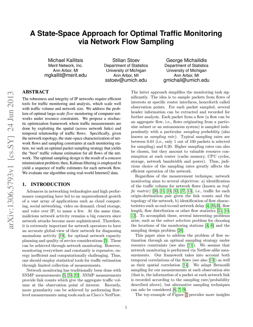 The robustness and integrity of IP networks require efficient tools for traffic monitoring and analysis, which scale well with traffic volume and network size. We address the problem of optimal large-scale flow monitoring of computer networks under resource constraints. We propose a stochastic optimization framework where traffic measurements are done by exploiting the spatial (across network links) and temporal relationship of traffic flows. Specifically, given the network topology, the state-space characterization of network flows and sampling constraints at each monitoring station, we seek an optimal packet sampling strategy that yields the best traffic volume estimation for all flows of the network. The optimal sampling design is the result of a concave minimization problem; then, Kalman filtering is employed to yield a sequence of traffic estimates for each network flow. We evaluate our algorithm using real-world Internet2 data.