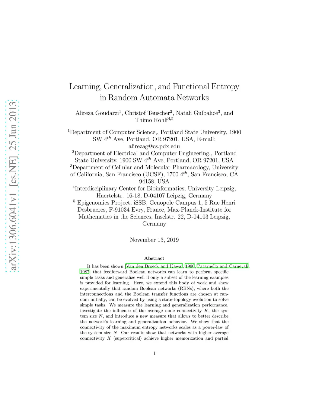 It has been shown \citep{broeck90:physicalreview,patarnello87:europhys} that feedforward Boolean networks can learn to perform specific simple tasks and generalize well if only a subset of the learning examples is provided for learning. Here, we extend this body of work and show experimentally that random Boolean networks (RBNs), where both the interconnections and the Boolean transfer functions are chosen at random initially, can be evolved by using a state-topology evolution to solve simple tasks. We measure the learning and generalization performance, investigate the influence of the average node connectivity , the system size , and introduce a new measure that allows to better describe the network's learning and generalization behavior. We show that the connectivity of the maximum entropy networks scales as a power-law of the system size . Our results show that networks with higher average connectivity (supercritical) achieve higher memorization and partial generalization. However, near critical connectivity, the networks show a higher perfect generalization on the even-odd task.